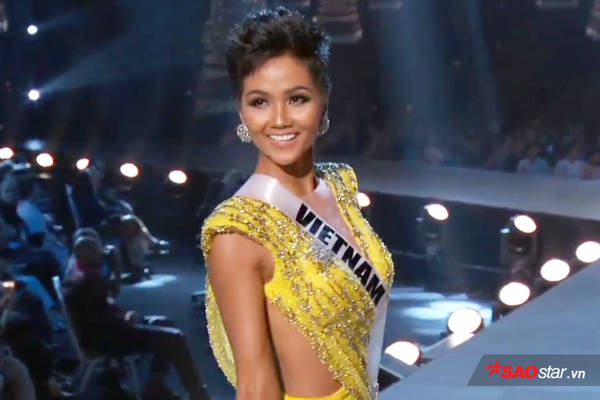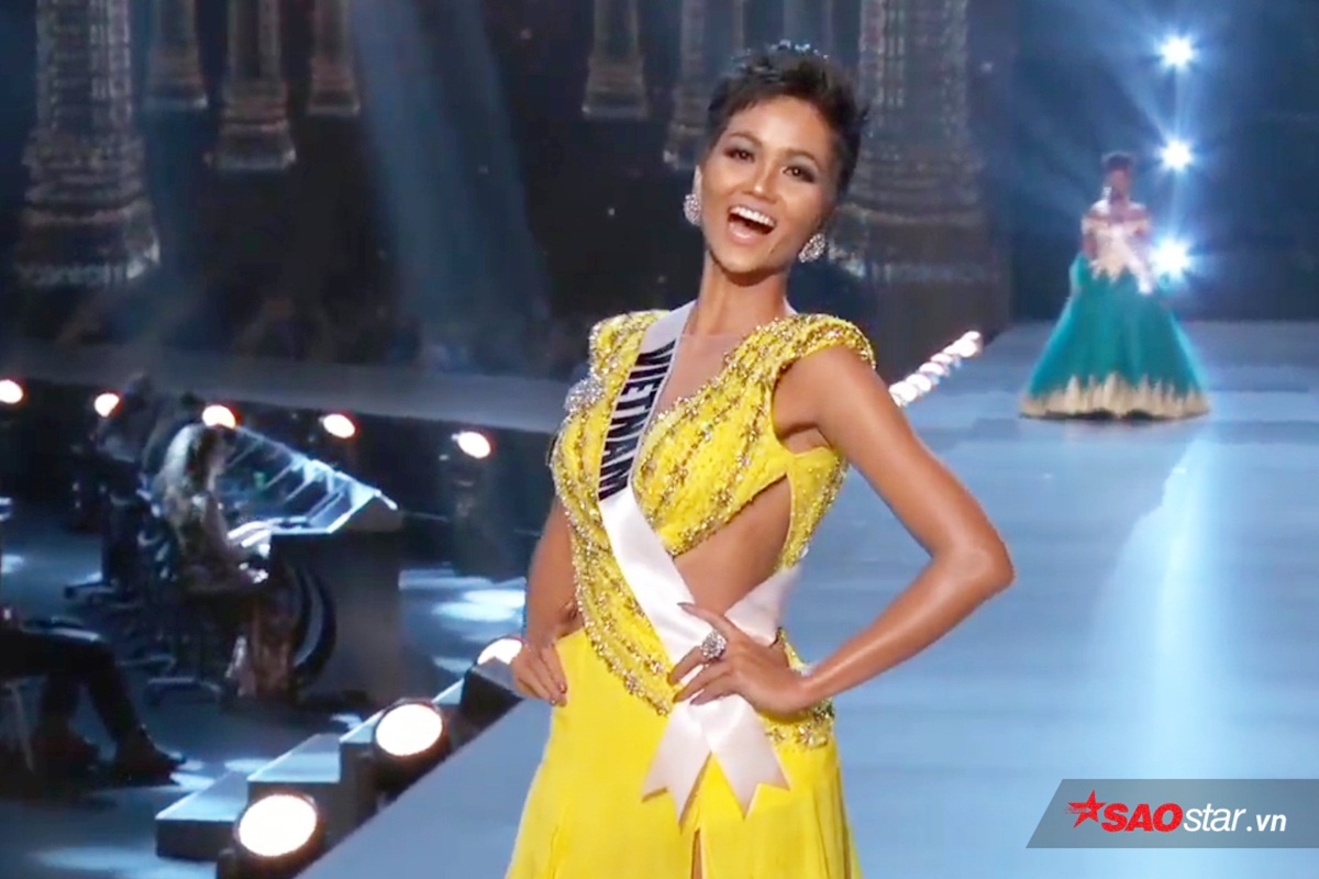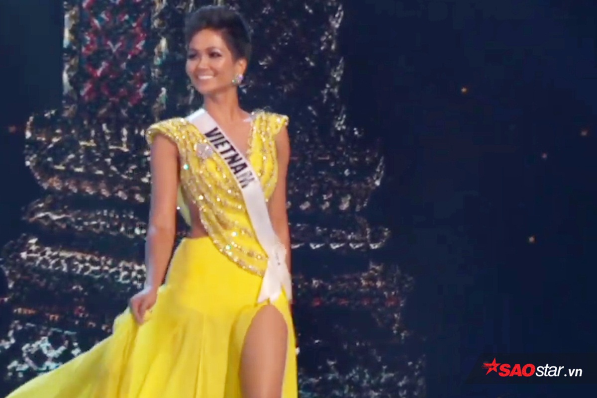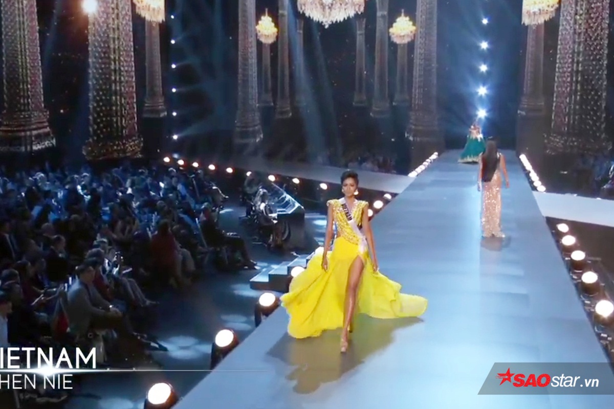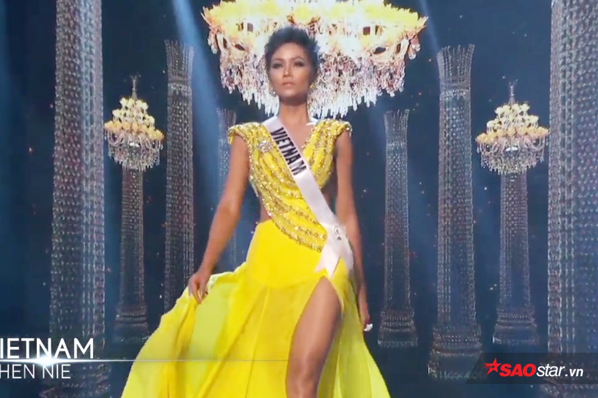 Đặc biệt, chiếc váy dạ hội vàng của nhà thiết kế Linh San đo ni đóng giày cho H'Hen Niê có độ bay bổng, tung tẩy càng khiến màn trình diễn của đại diện Việt Nam thêm cuốn hút, đẹp mắt.