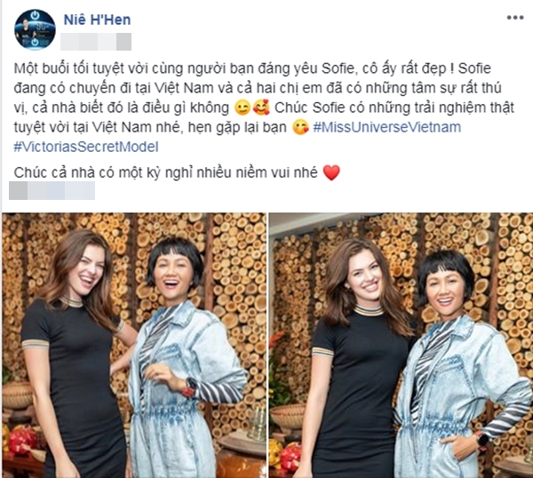 “Một buổi tối tuyệt vời cùng người bạn đáng yêu Sofie. Cô ấy rất đẹp. Sofie đang có chuyến đi tại Việt Nam và cả hai chị em đã có những tâm sự rất thú vị, cả nhà biết đó là điều gì không? Chúc Sofie có những trải nghiệm thật tuyệt vời tại Việt Nam nhé, hẹn gặp lại bạn” - H'Hen Niê chia sẻ.