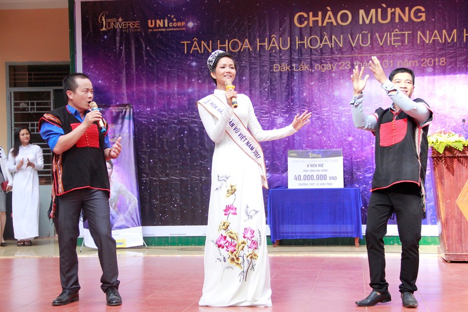 Ngày 8/1, H’Hen Niê có dịp trở lại trường Dự bị Đại học Dân tộc Trung ương Nha Trang - nơi cô từng theo học trước khi vào TP.HCM. Về trường với vai trò là tân Hoa hậu Hoàn vũ Việt Nam, người đẹp Ê Đê nhận được sự chào đón nồng nhiệt của mọi người có mặt tại đây. Chân dài sinh năm 1992 cũng trao học bổng cho những học sinh có hoàn cảnh khó khăn, giúp các bạn phần nào yên tâm học tập.