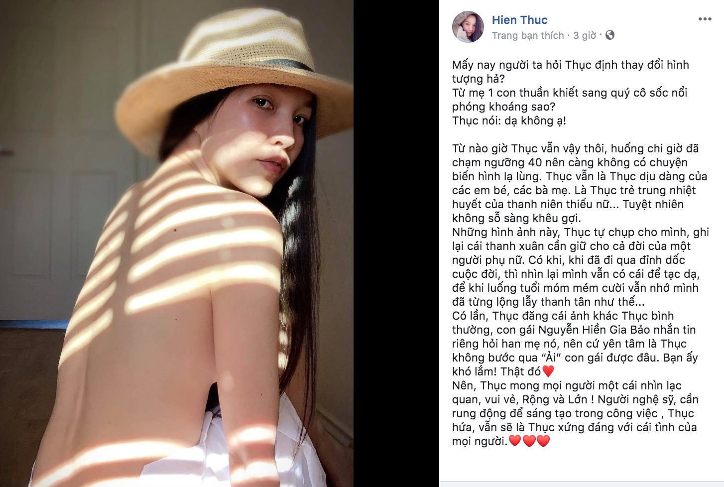 Cách đây vài giờ, Hiền Thục tiếp tục chia sẻ hình ảnh mới không kém phần nuột nà, gợi cảm so với hình ảnh trước đó. Giọng ca Yêu dấu theo gió bay còn đính kèm dòng trạng thái khá dài để đáp trả người hâm mộ: “Mấy nay người ta hỏi Thục định thay đổi hình tượng hả? Từ mẹ một con thuần khiết sang quý cô sốc nổi phóng khoáng sao? Thục nói: “Dạ không ạ”. Từ nào đến giờ Thục vẫn vậy thôi, huống chi giờ đã chạm ngưỡng 40 nên càng không có chuyện “biến hình” lạ lùng. Thục vẫn là Thục dịu dàng của các em bé, các bà mẹ. Là Hiền Thục trẻ trung nhiệt huyết của thanh niên thiếu nữ… Tuyệt nhiên không sỗ sàng khiêu gợi”.