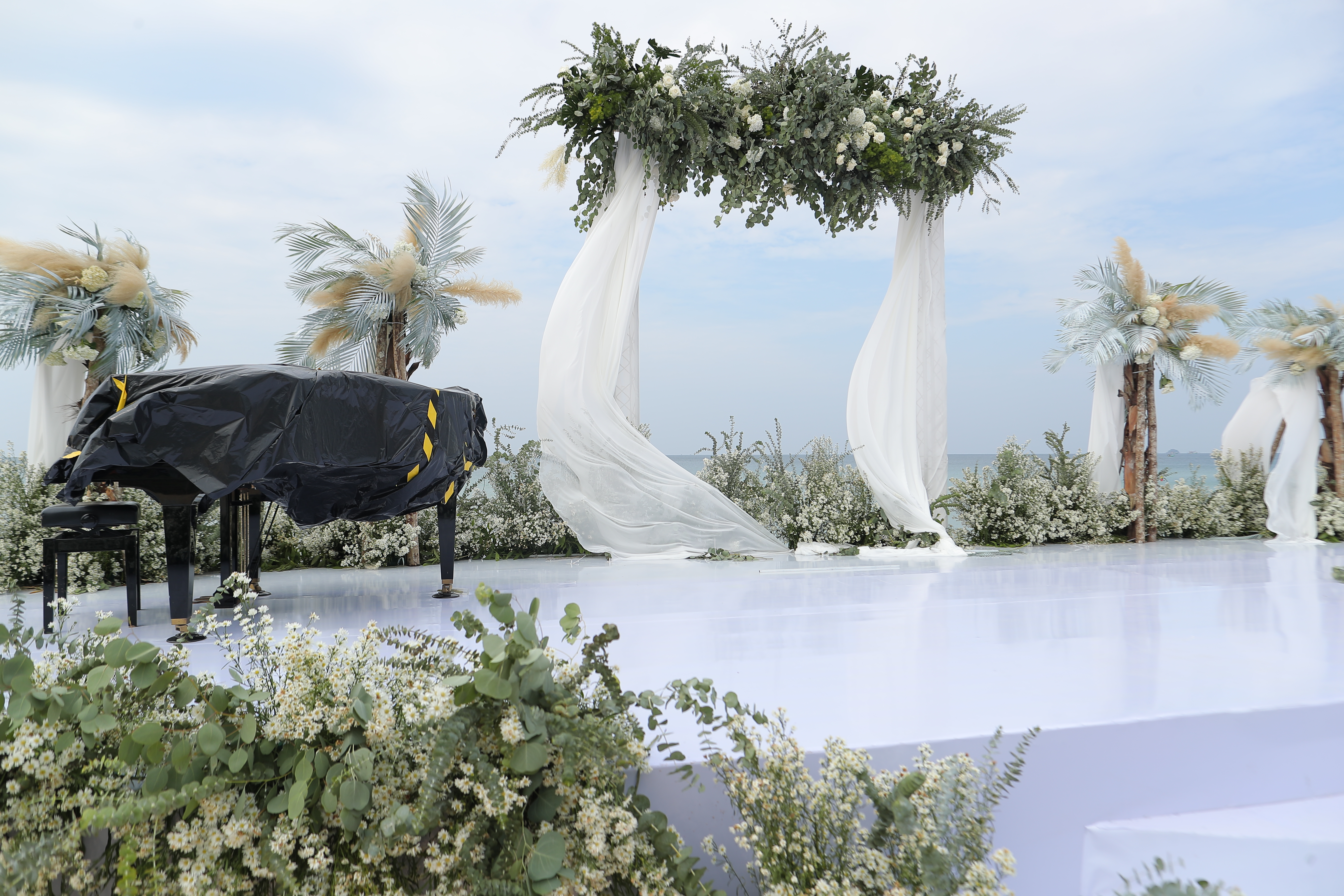 Ngoài dàn nhân sự “khủng” để trang hoàng cho hôn lễ, 6 xe tải 10 tấn chuyên dụng để chở thiết bị âm thanh ánh sáng bảo đảm mọi thứ được chỉn chu nhất. Dàn hoa baby trang trí nhập ngoại lên đến số lượng 2 tấn. Với bãi biển diện tích hơn 8 000 mét vuông được trang hoàng đẹp mắt, hai nhân vật chính cùng dàn khách mời hứa hẹn có một đêm tiệc đáng nhớ.