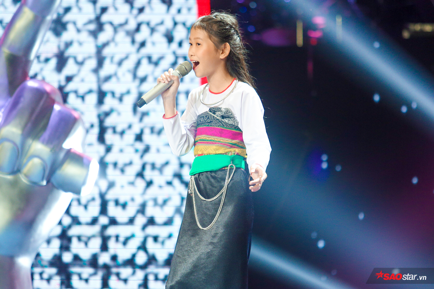 Xuất hiện trên sân khấu vòng Giấu mặt bằng bộ trang phục truyền thống của người Mường, cô bé tạo được ấn tượng khó nhầm lẫn với các thí sinh khác của mùa này.