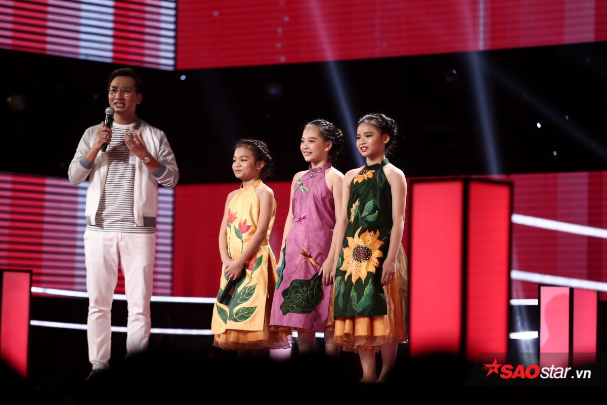 Sự điệu đà trong từng câu hát càng làm nên sự duyên dáng cho các thí sinh đội HLV Soobin Hoàng Sơn. Trong trang phục cách tân của chiếc áo tứ thân, ba cô nàng trở nên xinh xắn hơn trong ca khúc Chuồn chuồn ớt nhí nhảnh.
