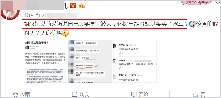 Thế nhưng vào tối qua, chuyện này lại xuất hiện một bước ngoặt mới khi có blogger trực tiếp đăng hình ảnh tiết lộ Hồ Ngạn Bân “mua thủy quân” (mua tài khoản ảo nhằm bênh vực cho mình). Bên cạnh đó, blogger còn cho biết: Trong một buổi phỏng vấn trước đây, Hồ Ngạn Bân tiết lộ mình là người Ninh Ba chứ không phải trở thành “người Thượng Hải như bây giờ”. Nguyên văn câu nói của Hồ Ngạn Bân: “Rất nhiều tài liệu trên mạng đều nói tôi là người Thượng Hải nhưng thực ra tôi là người Ninh Ba, chính xác mà nói là người Dư Diêu”.