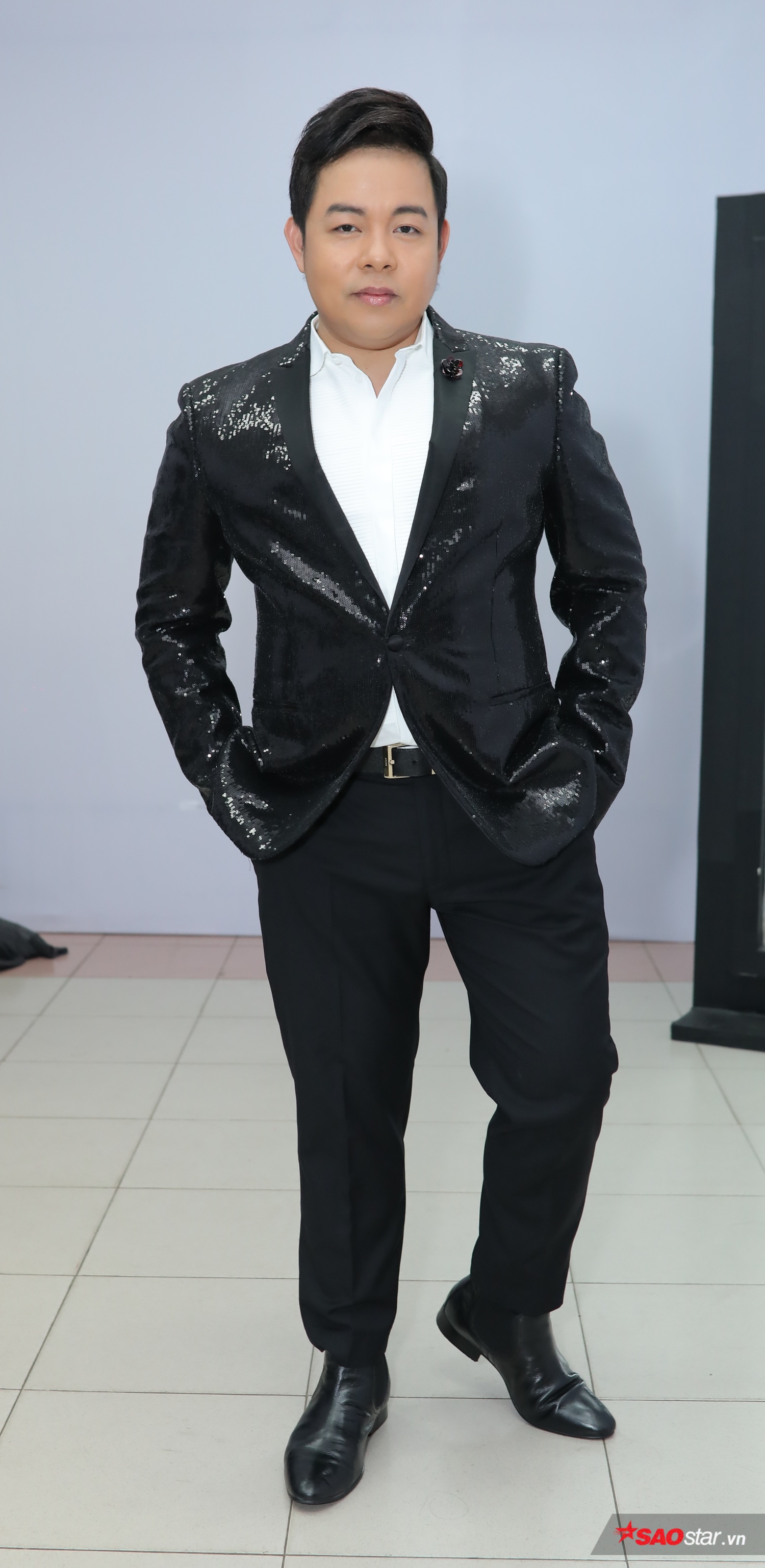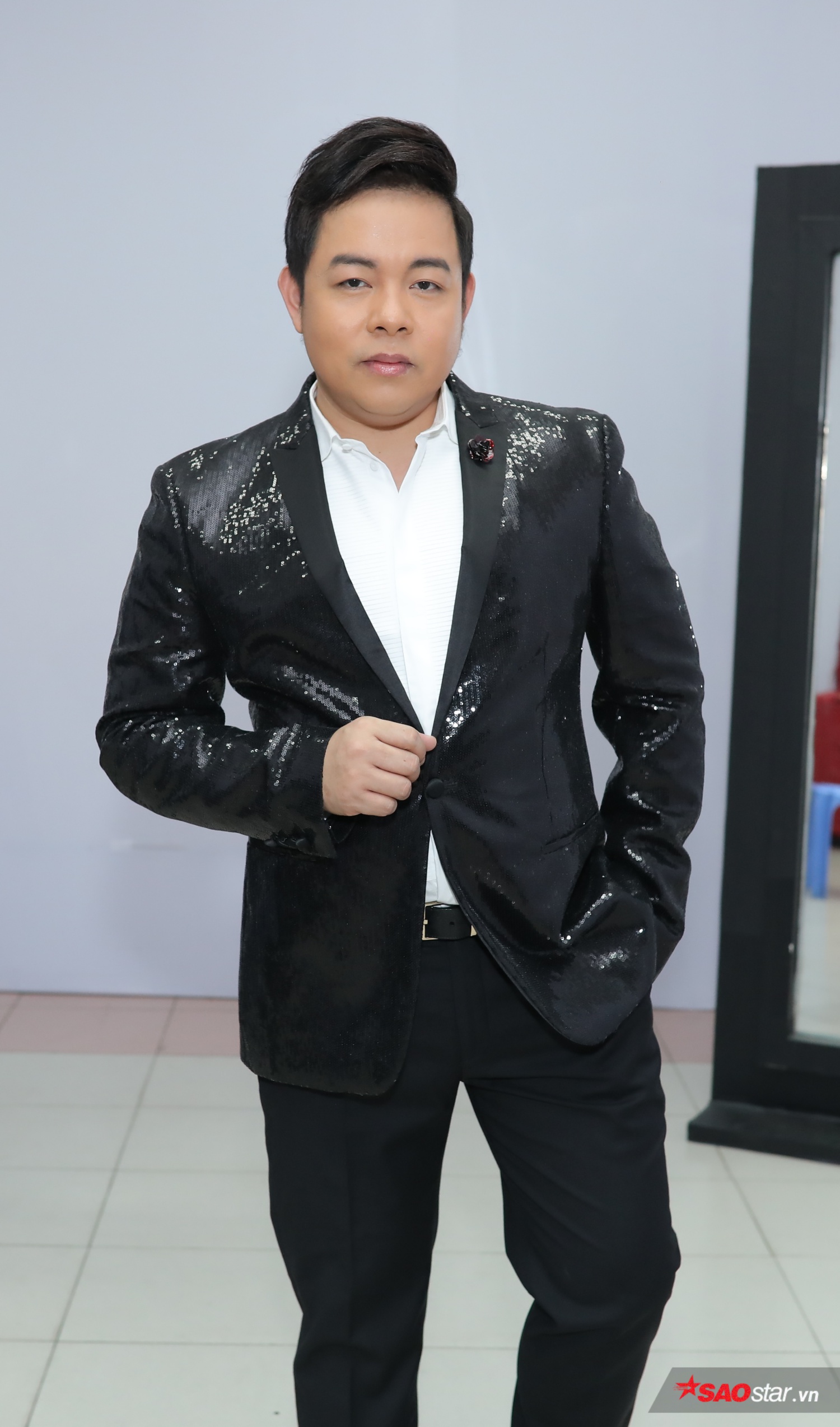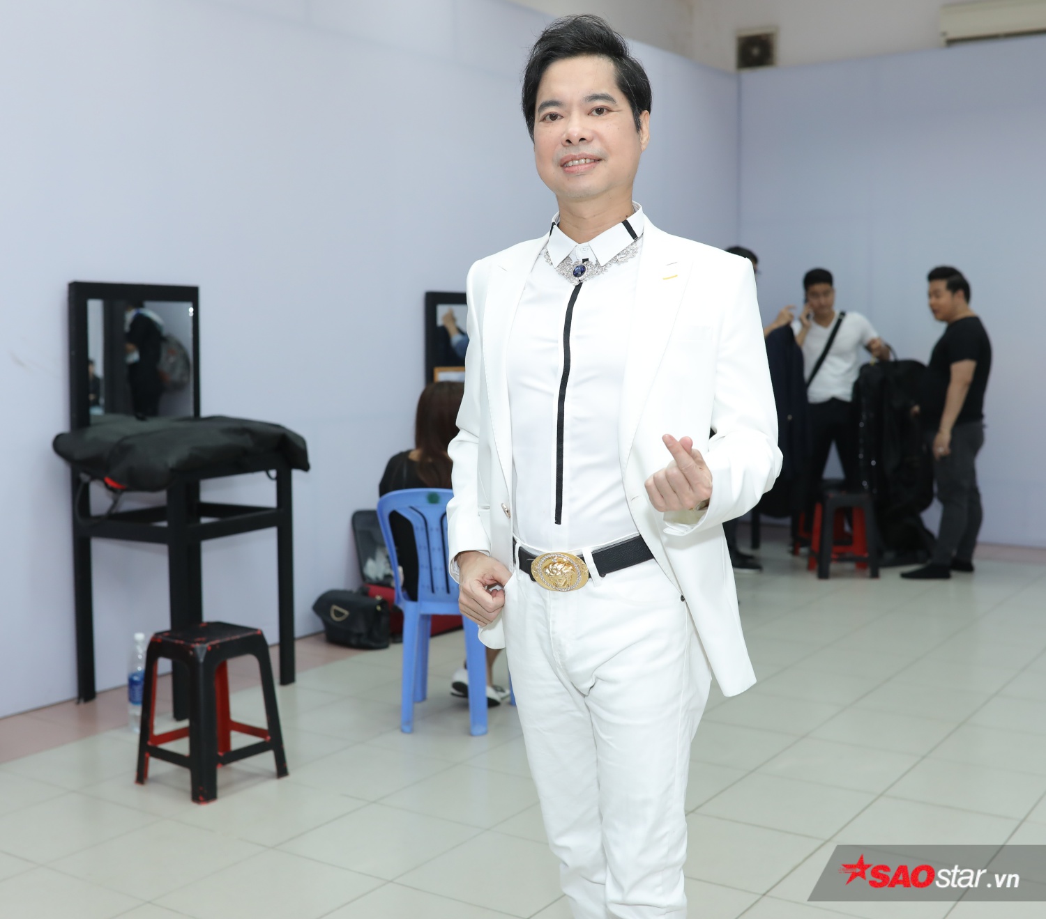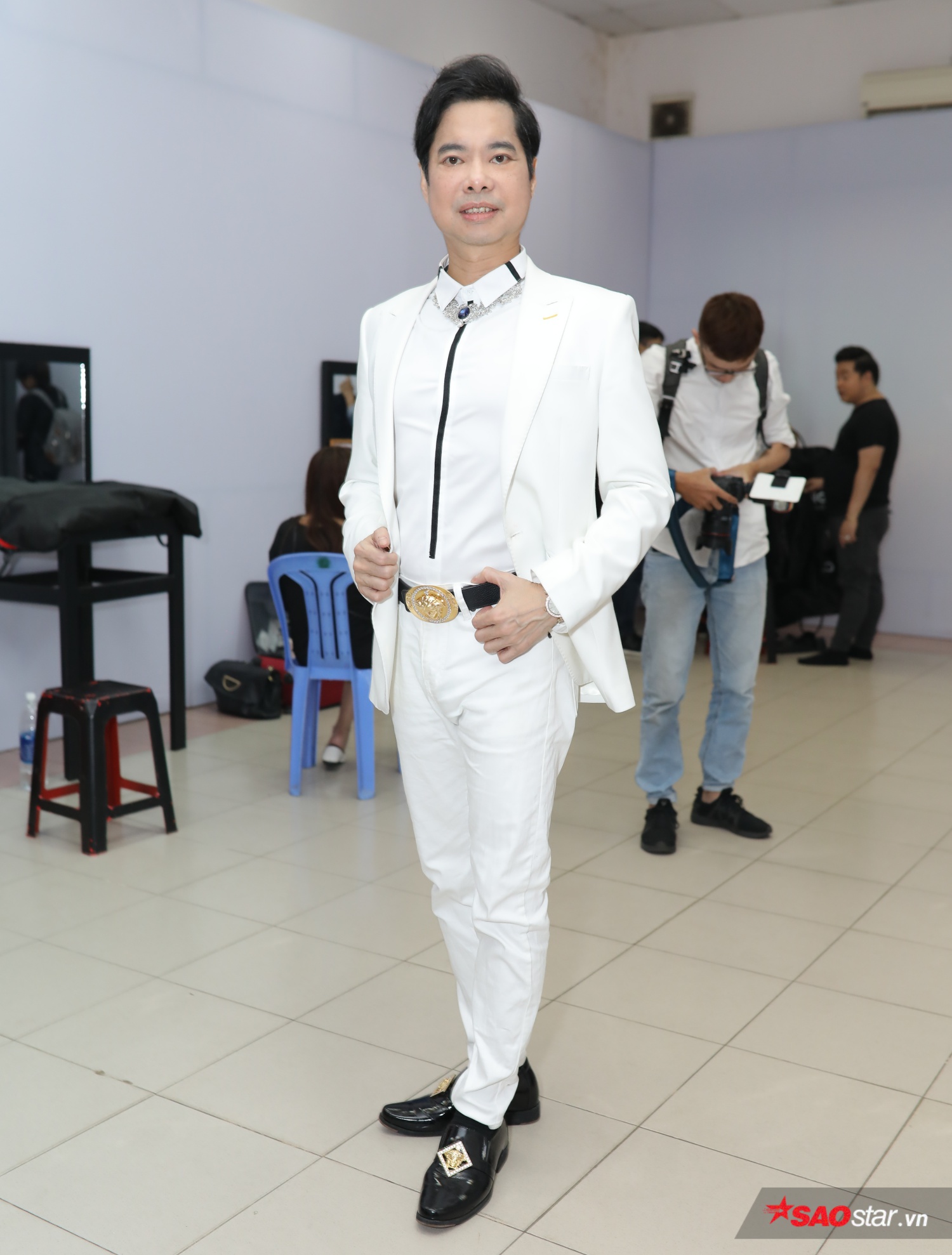 HLV Ngọc Sơn xuất hiện chỉn chu với vest trắng sang trọng.