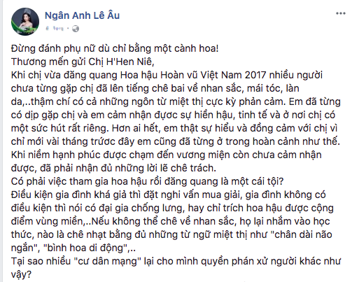 Cụ thể, người đẹp 21 tuổi viết: “Thương mến gửi Chị H'Hen Niê. Khi chị vừa đăng quang Hoa hậu Hoàn vũ Việt Nam 2017 nhiều người chưa từng gặp chị đã lên tiếng chê bai về nhan sắc, mái tóc, làn da… Thậm chí có cả những ngôn từ miệt thị cực kỳ phản cảm.