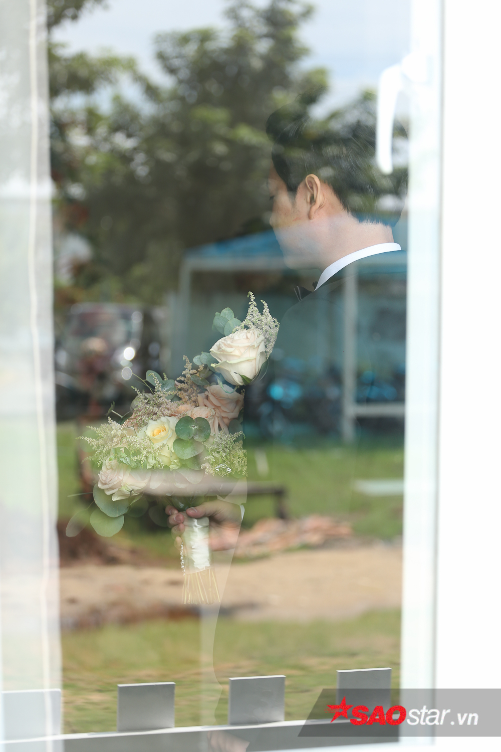 Chú rể Trung Tín cầm hoa cưới tiến vào nhà để chuẩn bị làm thủ tục xin dâu.