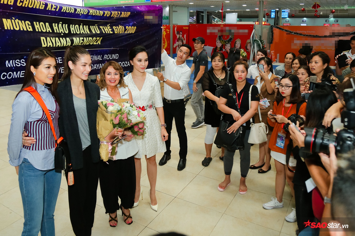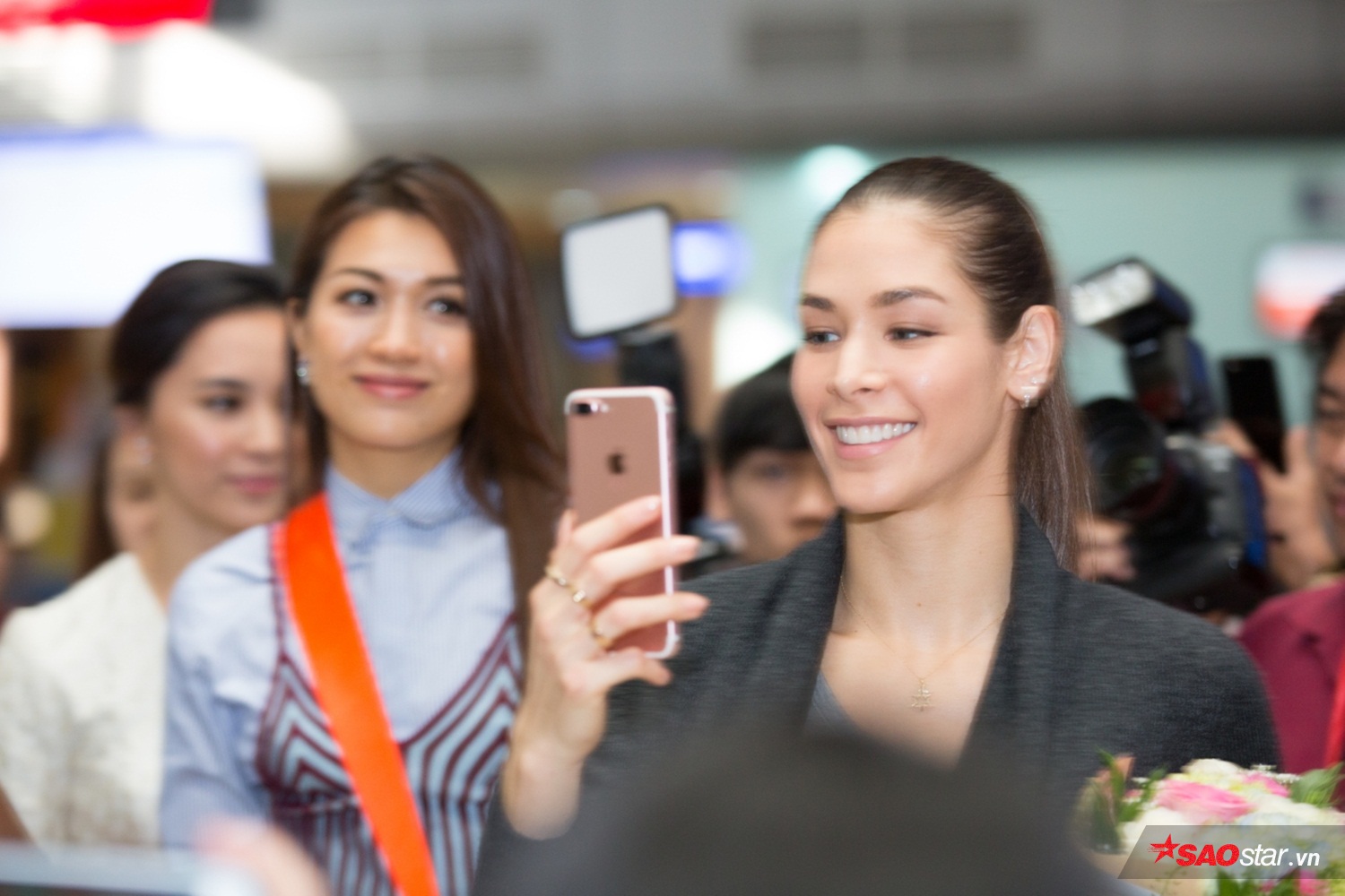 Trước đó, xuất hiện tại sân bay Tân Sơn Nhất (TP.HCM), người đẹp mặc đơn giản. Cô được tiếp đón bởi Á hậu Dương Trương Thiên Lý, Á hậu Lệ Hằng cùng người hâm mộ.