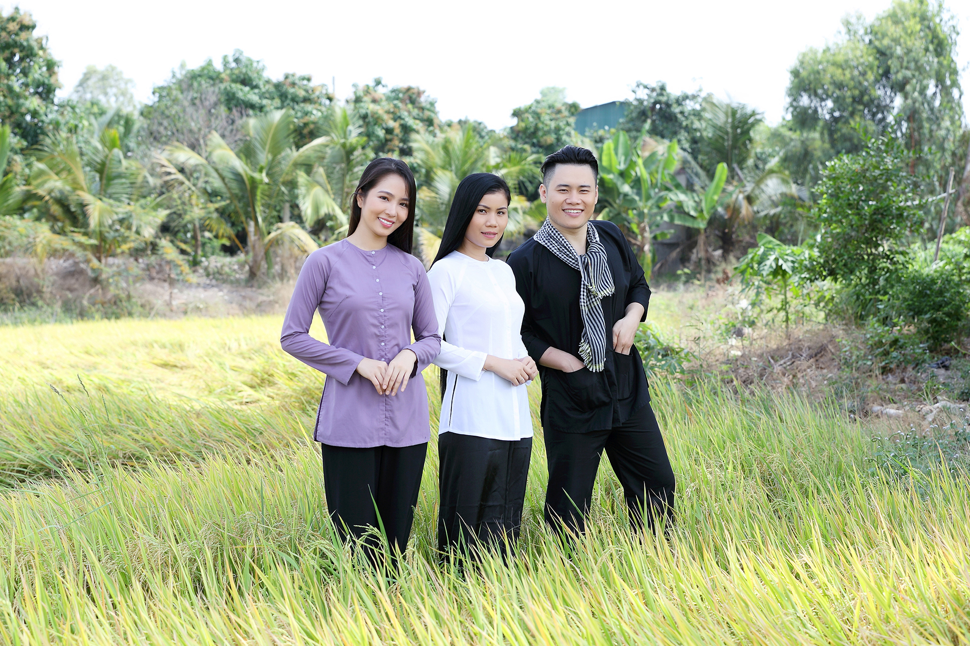 Từ trái sang: Dương Kim Ánh, ca sĩ Phương Nhạc và ca sĩ Trần Long cũng tham gia diễn xuất trong dự án phim ca nhạc “Trở lại sông quê”.