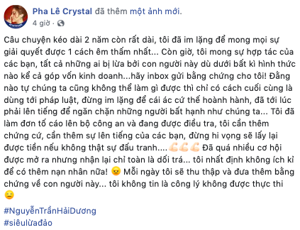 Về phía Pha Lê, nữ ca sĩ tiếp tục có động thái lên tiếng chế giễu và tiếp tục khẳng định ông Kim Duck Ho đã về Hàn Quốc. Đồng thời cho biết, bức hình hạnh phúc bên ông xã của Hải Đường chỉ là ảnh cũ, đăng tải lên chỉ để “tung hỏa mù”.