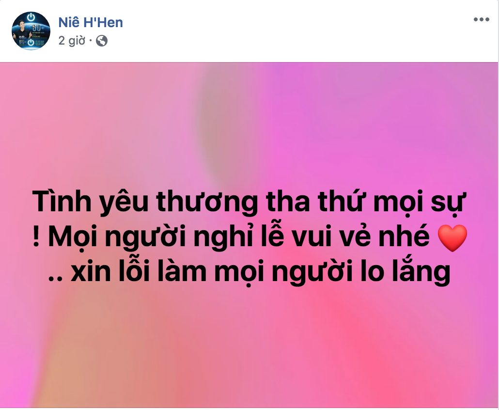 Sau khi đăng tải được ít phút thì Hoa hậu Ê-đê đã có động thái tháo bỏ status và viết một dòng trạng thái mới với nội dung: “Tình yêu thương tha thứ mọi sự ! Mọi người nghỉ lễ vui vẻ nhé. Xin lỗi làm mọi người lo lắng“.