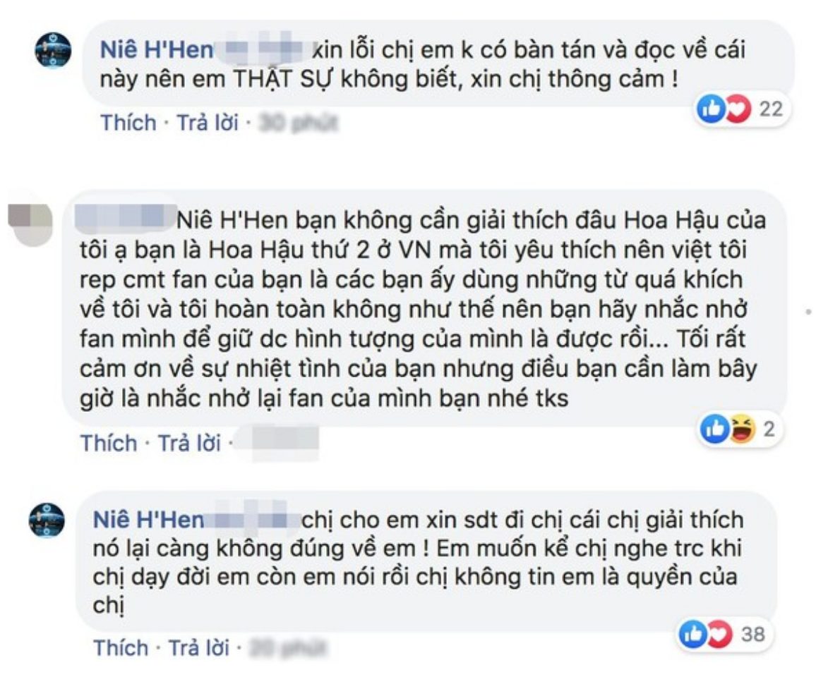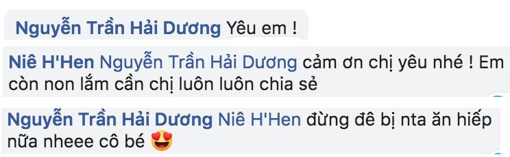 Nhận được sự quan tâm của đàn chị, H'Hen Niê rất mực biết ơn và mong muốn nhận được nhiều hơn những chia sẻ từ Hoa hậu Hải Dương vì tự nhận bản thân còn non nớt. Bên cạnh đó, các fan cũng khuyên hoa hậu nên sử dụng mạng xã hội một cách tích cực, những “lùm xùm” không đáng có như thế này nên giải quyết triệt để và trực tiếp.