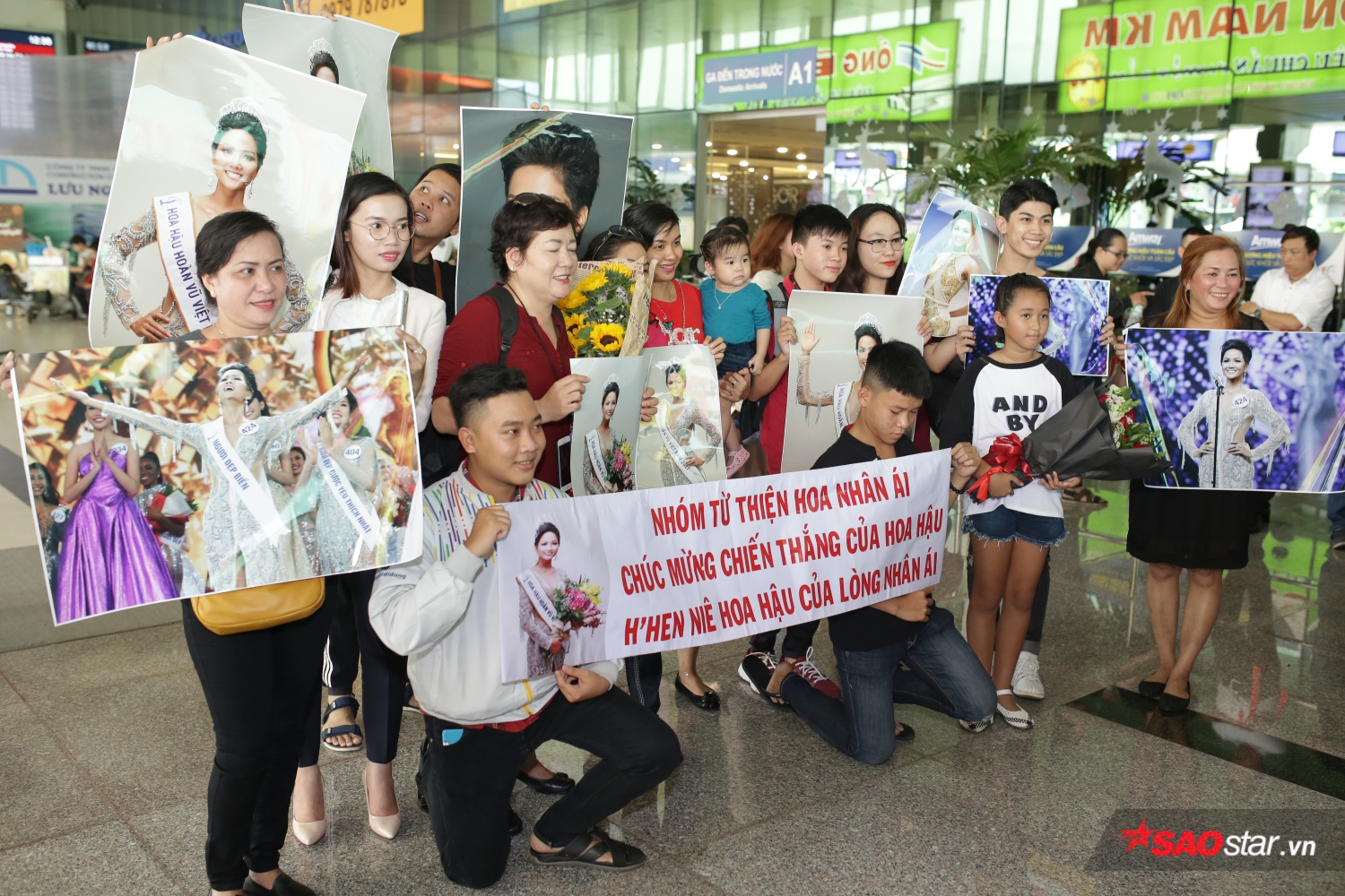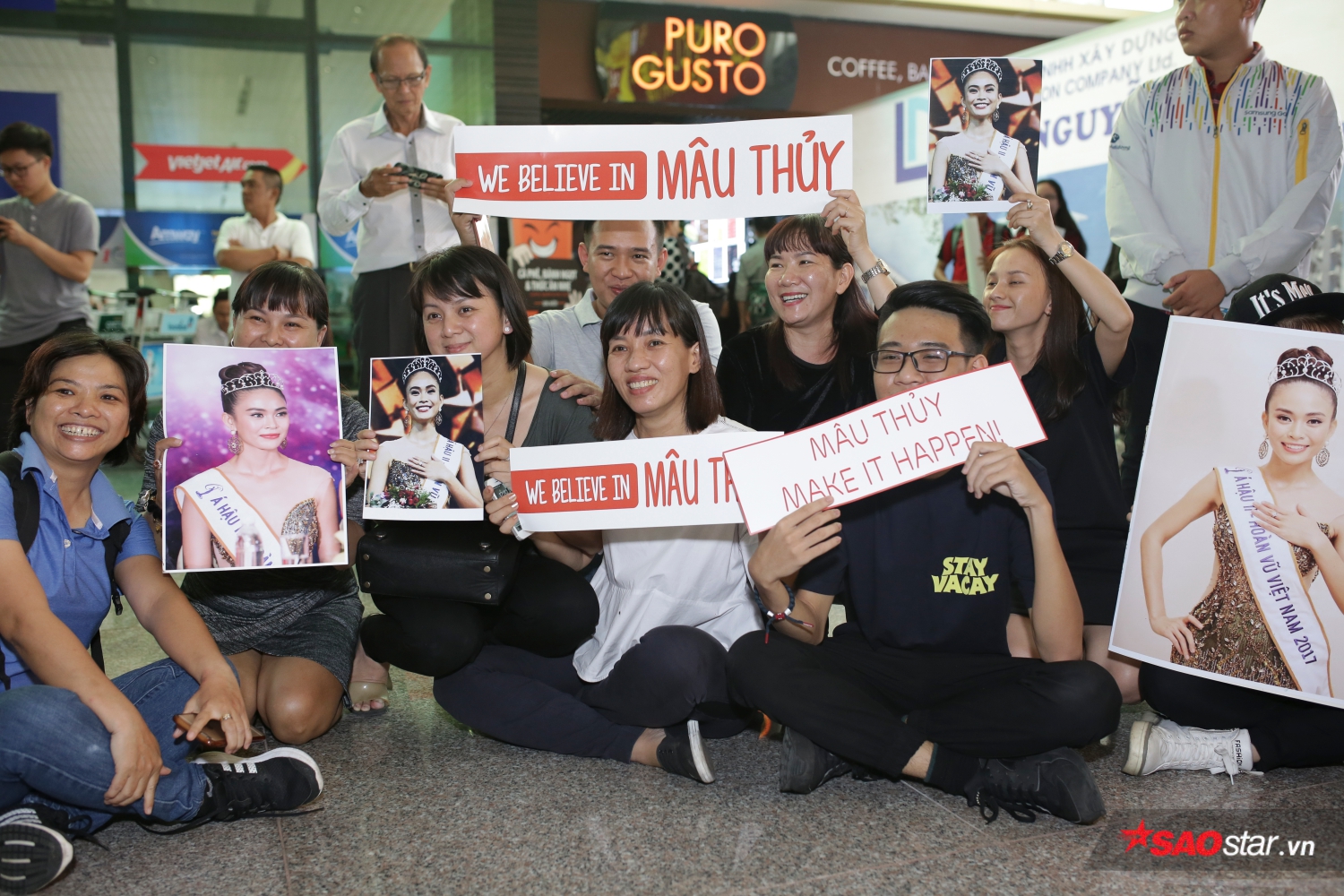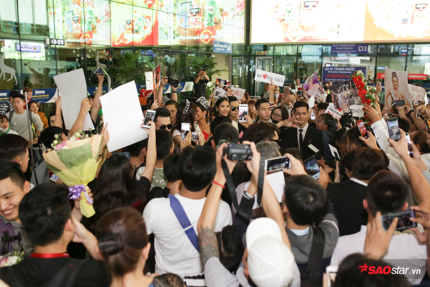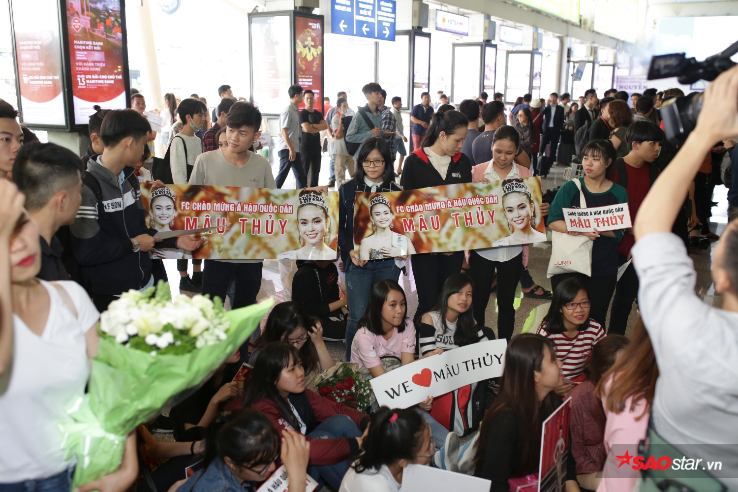 Rất đông người hâm mộ với băng rôn, khẩu hiệu có mặt từ sớm tại sân bay để chào đón đương kim Hoa hậu Hoàn vũ Việt Nam cũng như hai Á hậu.