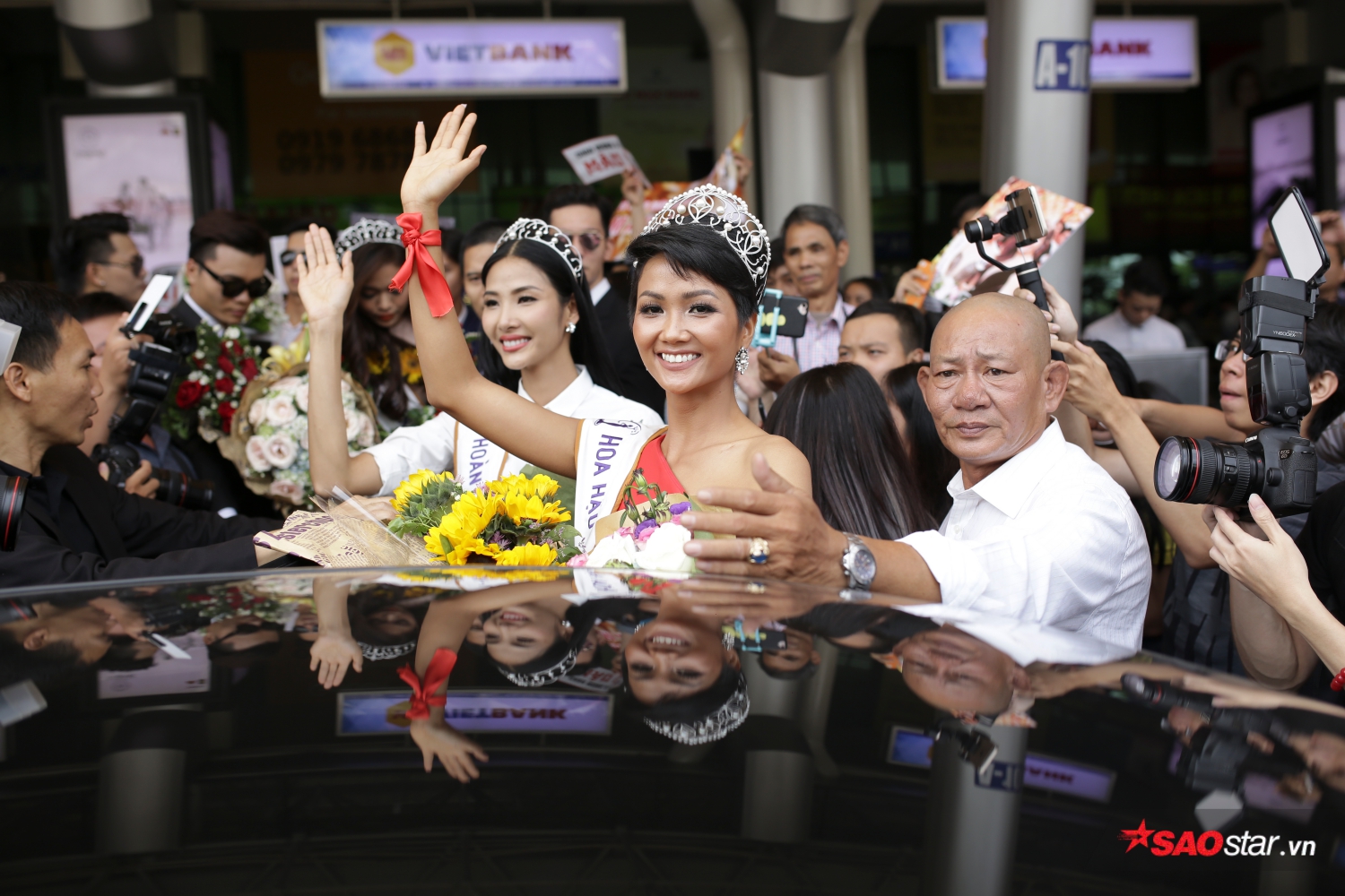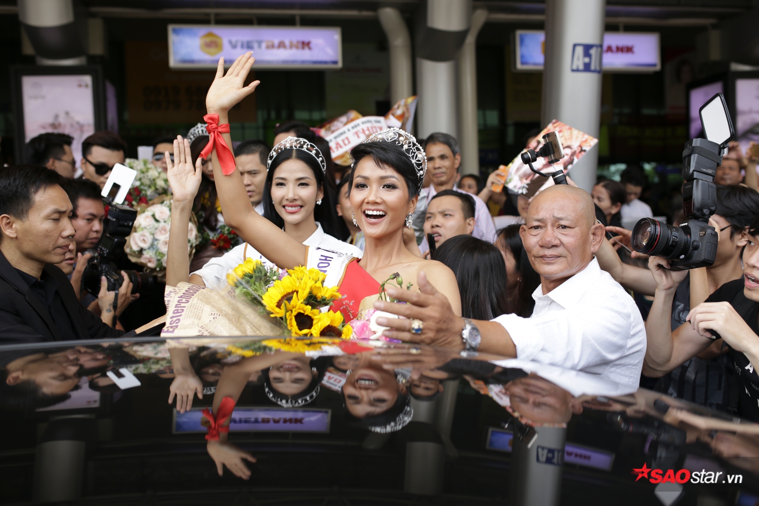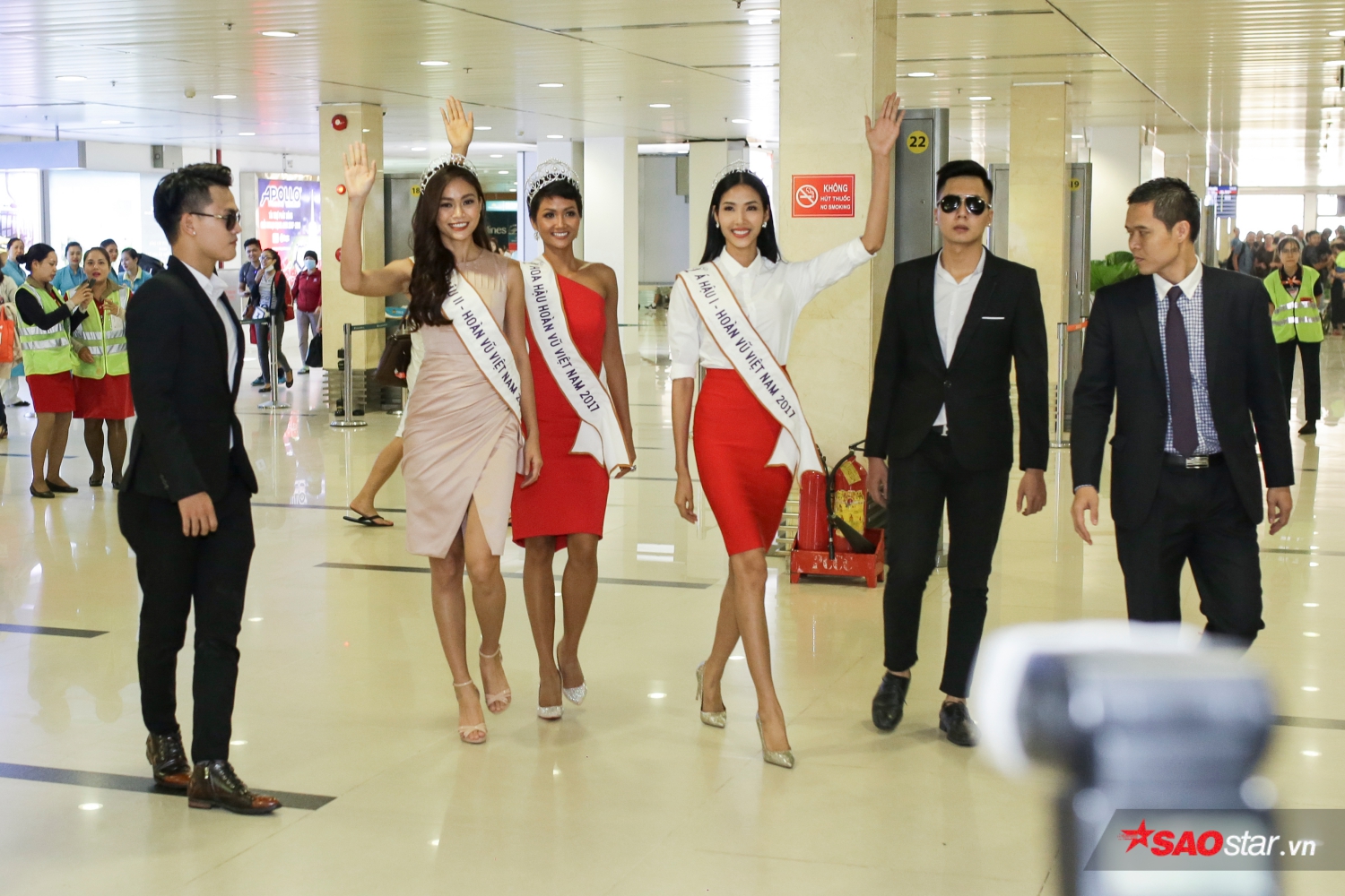 Trưa 9/1, Hoa hậu H'Hen Niê cùng hai Á hậu Hoàng Thuỳ, Mâu Thuỷ đáp chuyến bay từ Nha Trang về TP.HCM sau khi đăng quang Miss Universe Vietnam 2017 vào tối 6/1. Xuất hiện với vẻ ngoài rạng rỡ, nụ cười luôn nở trên môi, 3 người đẹp nhanh chóng nhận được sự chú ý kể từ khi bước xuống máy bay.