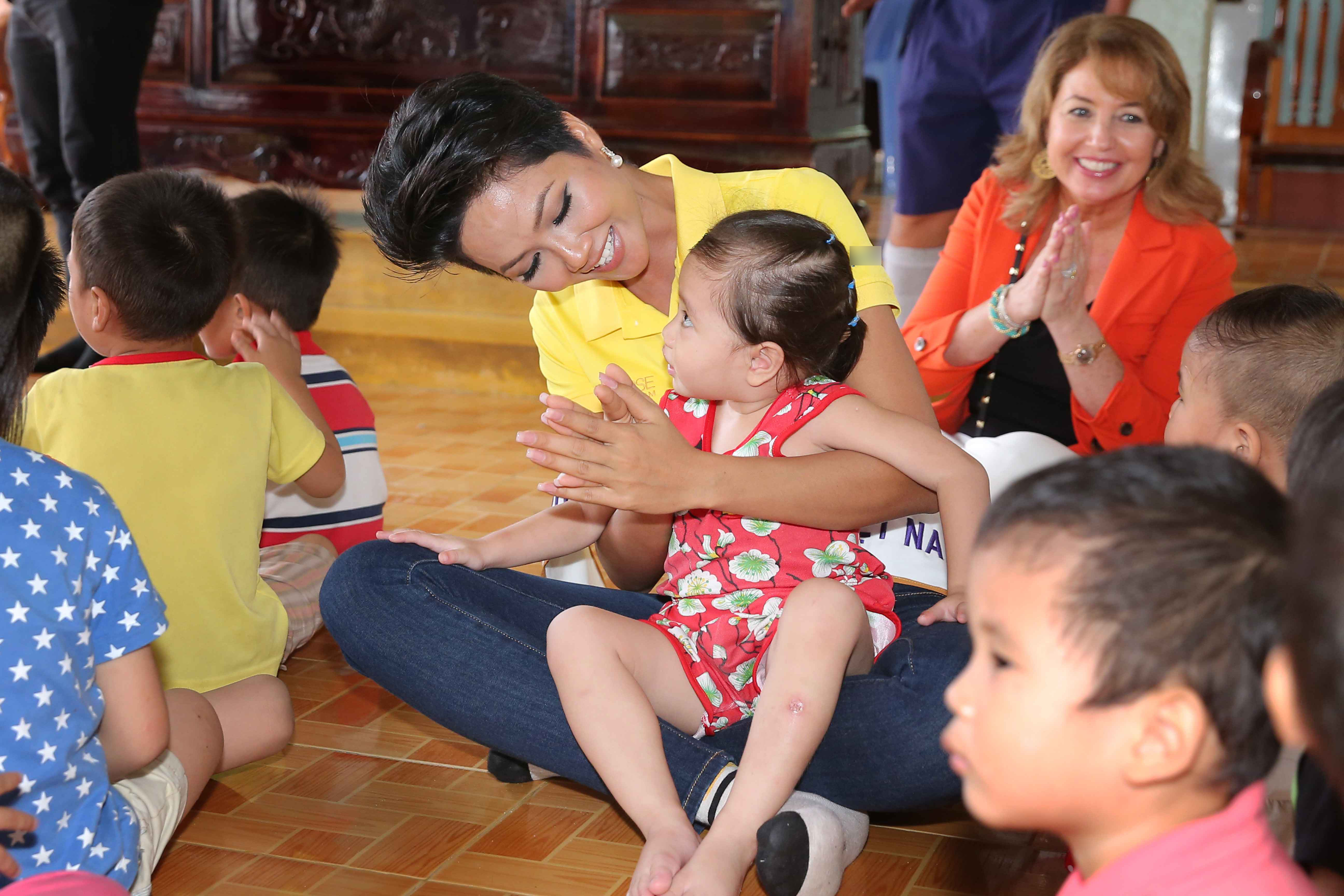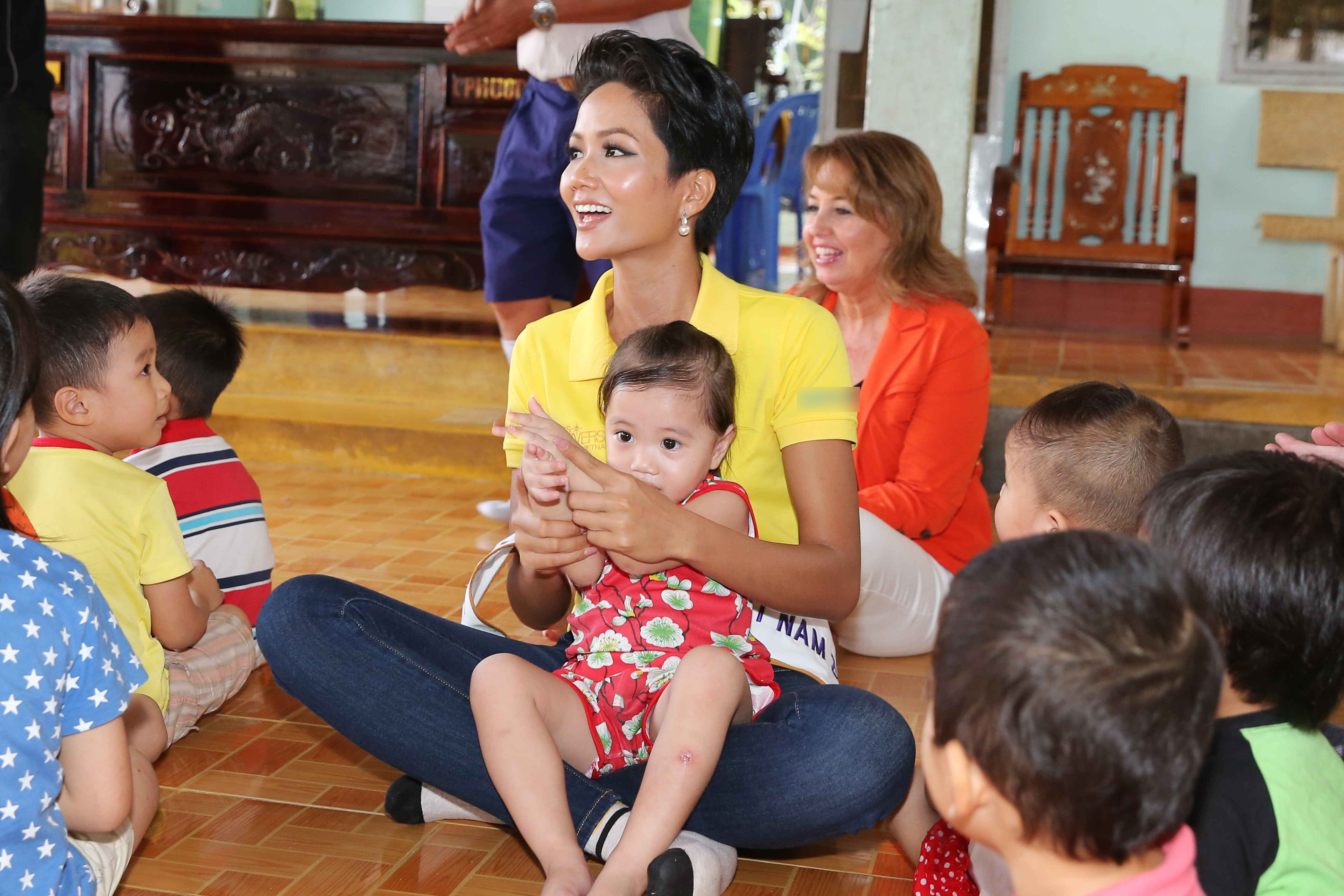 Không trang phục lộng lẫy như đêm chung kết, Hoa hậu H’Hen Niê và Á hậu Hoàng Thùy, Mâu Thủy vô cùng giản dị trong chiếc áo phông, quần jean thân thiện chơi đùa cùng các em nhỏ. Người đẹp Ê Đê chia sẻ: “Tôi rất vui vì được đến thăm và chơi đùa cùng các bé. Sự hồn nhiên, vô tư ấy khiến tôi thấy ấm lòng hơn. Tôi thấy mình cần phải đi nhiều nơi hơn nữa để lan tỏa tình yêu thương đến tất cả mọi người. Đó là trách nhiệm mà tôi nhận thức được khi khoác lên người danh hiệu tân Hoa hậu Hoàn vũ Việt Nam”.