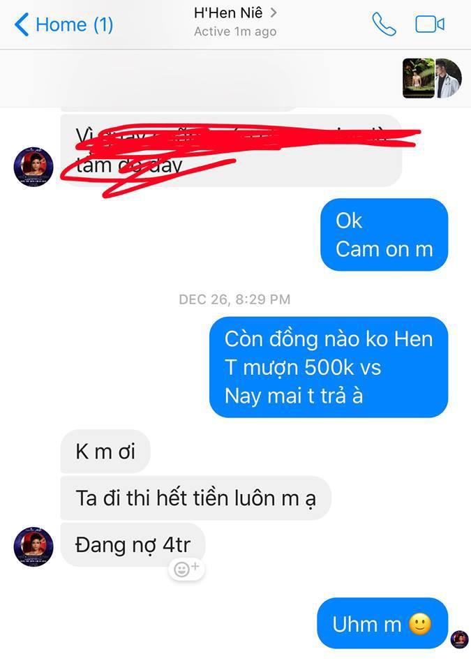 Cụ thể, nam người mẫu này đã hỏi mượn H'Hen Niê 500.000 đồng. Tuy nhiên, do chuẩn bị cho cuộc thi, người đẹp gốc Đắk Lắk cũng phải đi vay mượn. Cô thật thà trả lời mình vẫn đang nợ 4 triệu đồng và không còn tiền trong người.