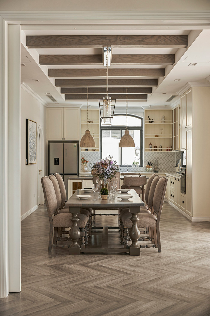 Tầng trệt bao gồm phòng khách, bếp và phòng dành cho gia nhân. Phía trước nhà là khoảng sân vườn rộng rãi, còn phía sau là khu giặt phơi. Từ khu vực bàn ăn, có thể nhìn ra tiểu cảnh và hồ cá Koi tạo cảm giác thư thái, gần gũi với thiên nhiên.