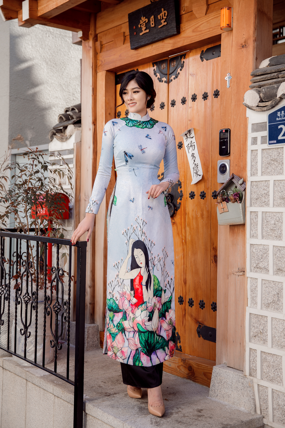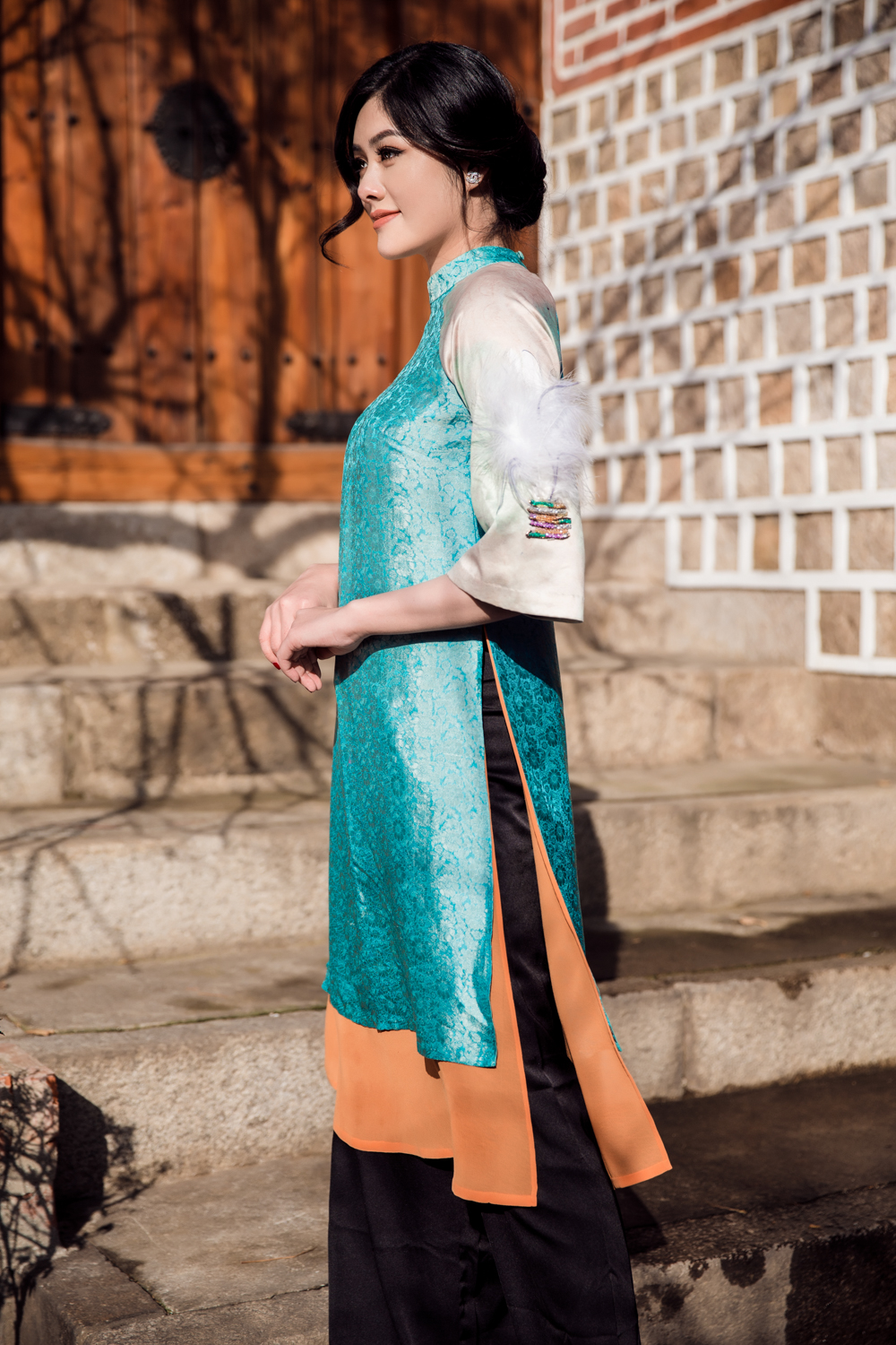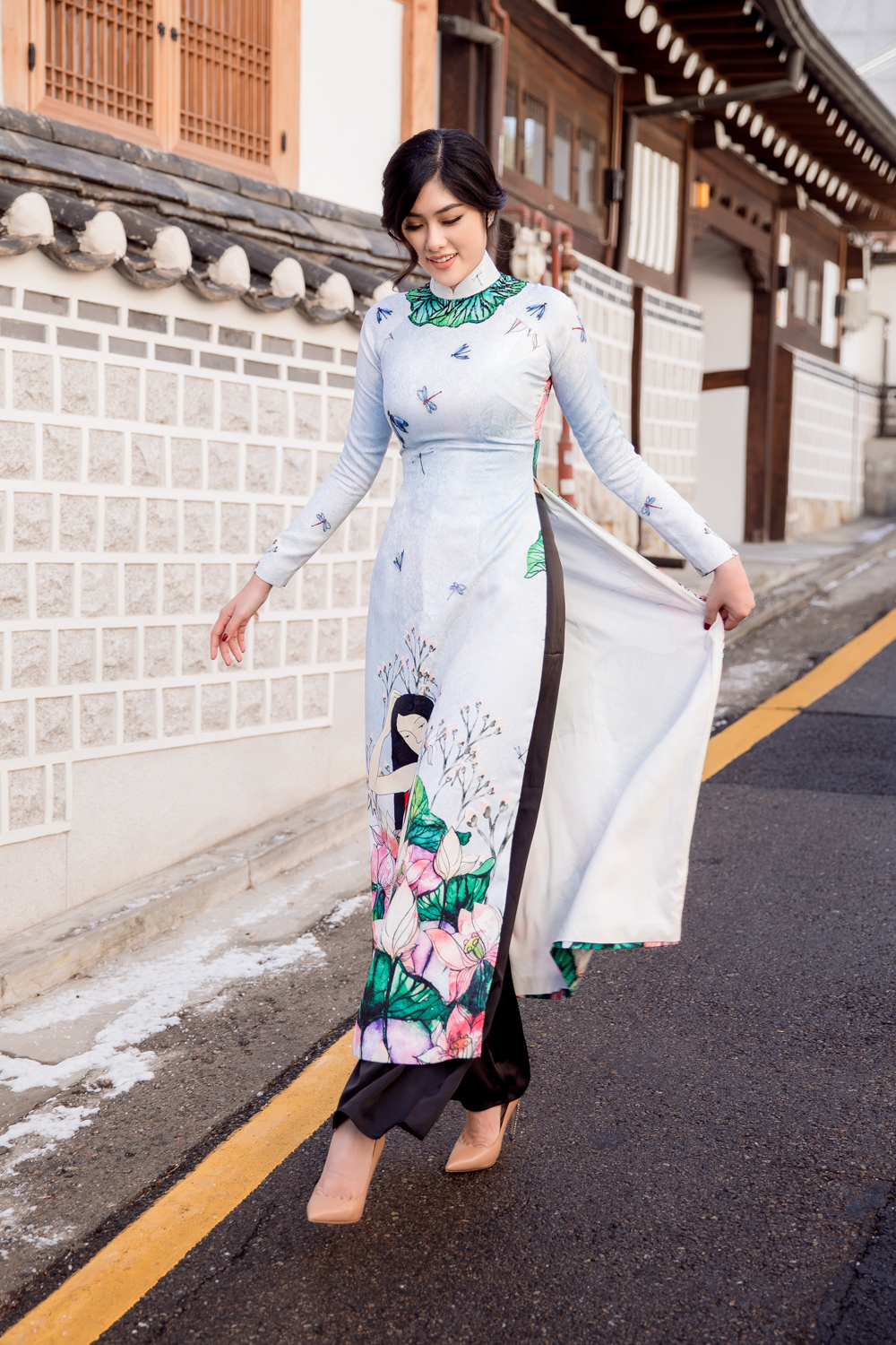 Người đẹp diện cho mình 2 mẫu áo dài trong BST mới nhất của NTK Thủy Nguyễn trên đường phố Seoul. Huỳnh Tiên chọn cho mình mẫu áo dài cách tân vừa hiện đại vừa dịu dàng, nữ tính.