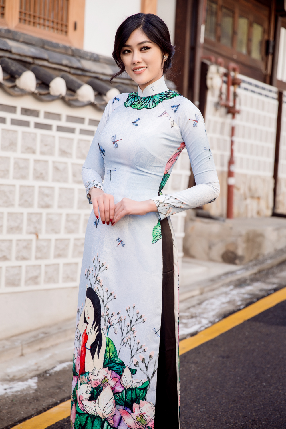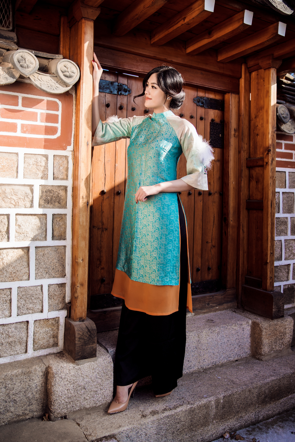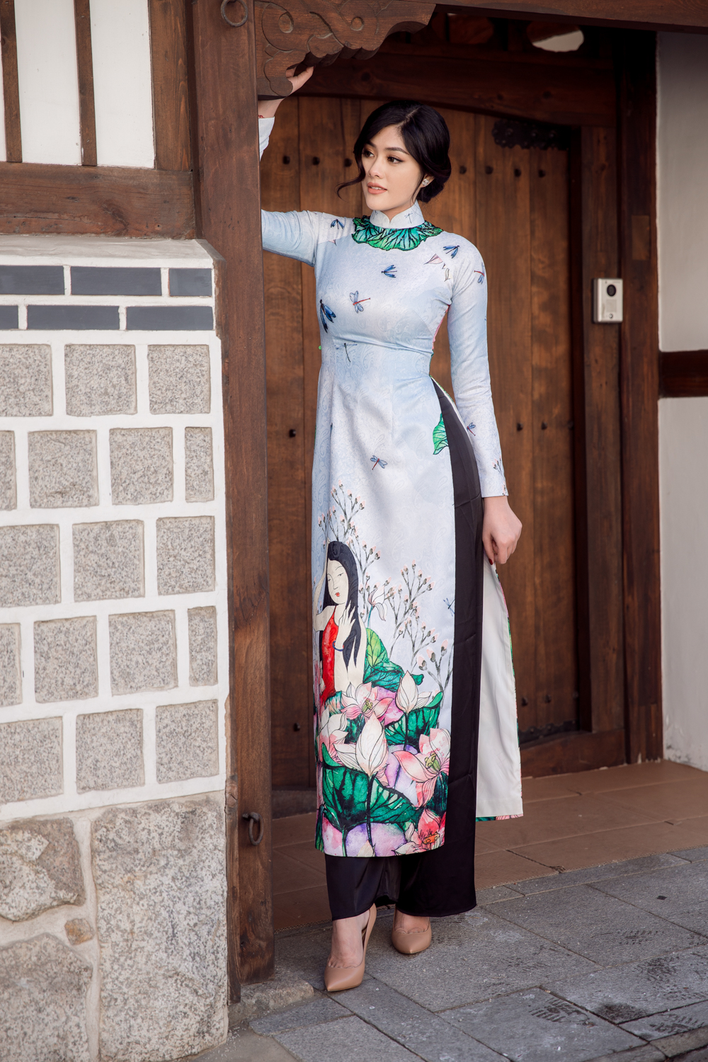 Người đẹp diện cho mình 2 mẫu áo dài trong BST mới nhất của NTK Thủy Nguyễn trên đường phố Seoul. Huỳnh Tiên chọn cho mình mẫu áo dài cách tân vừa hiện đại vừa dịu dàng, nữ tính.