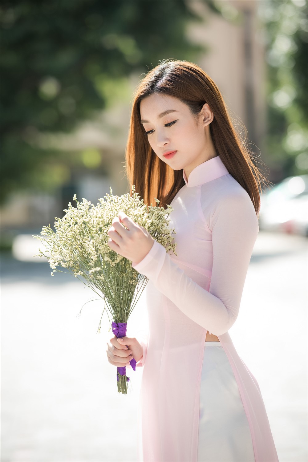 Trút bỏ những xiêm y lộng lẫy khi xuất hiện trong các sự kiện giải trí, Mỹ Linh diện chiếc áo dài màu hồng đơn giản, mái tóc xõa thẳng nhẹ nhàng. Cộng thêm đó, hình thể chuẩn được chiếc áo dài truyền thống Việt tôn vinh hết cỡ khiến cho người xem không thể rời mắt trước một Mỹ Linh thanh thoát, thuần khiết trong bộ ảnh.