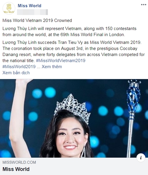 Fanpage của Miss World nhanh chóng cập nhật thông tin về đại diện Việt Nam tham dự cuộc thi vào cuối năm nay.