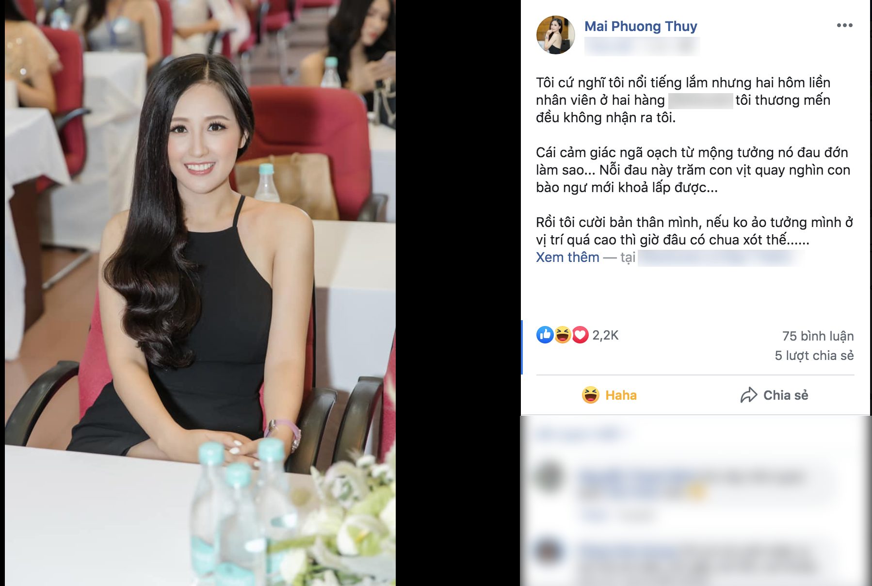 Dòng tâm trạng buồn đau của Mai Phương Thúy còn được một bé nhân viên “xát muối” khi cô bị nhầm lẫn là thí sinh The Voice. Hoa hậu hóm hỉnh chia sẻ suy nghĩ khi biết mình không nổi tiếng “phủ sóng” và được nhiều người nhận ra nơi công cộng: “Cái cảm giác ngã oạch từ mộng tưởng nó đau đớn làm sao. Nỗi đau này trăm con vịt quay nghìn con bào ngư mới khoả lấp được”.