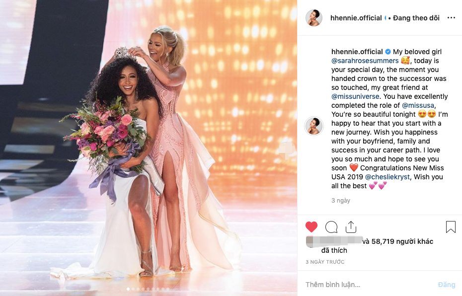 Dù cuộc thi đã kết thúc hơn nửa năm, nhưng Hen và Sarah vẫn luôn dõi theo hành trình của nhau trên mạng xã hội. Trong những giây phút cuối cùng cô bạn của mình còn đương nhiệm danh hiệu Miss USA và khi trao lại vương miện cho người kế nhiệm, H'Hen Niê đã luôn theo dõi qua màn ảnh nhỏ để “đồng hành” cùng Sarah.