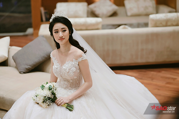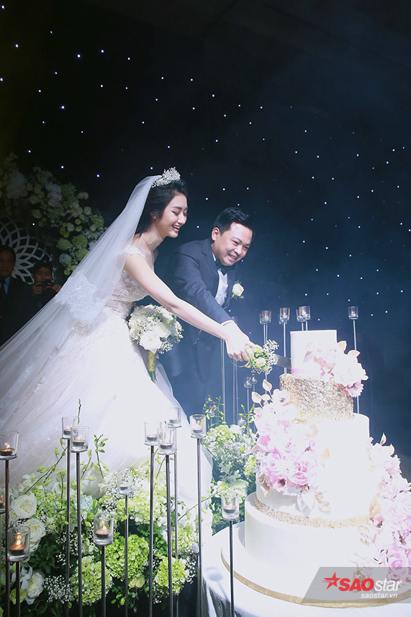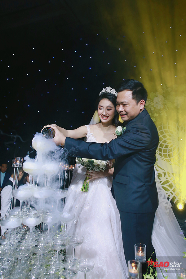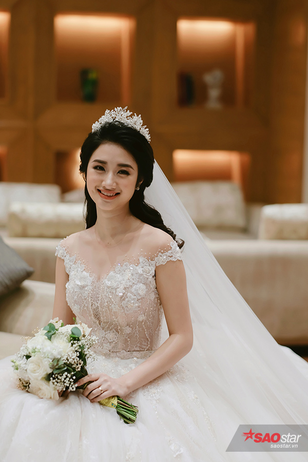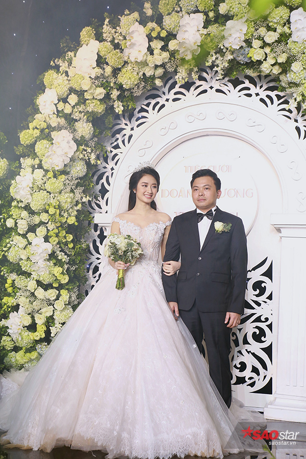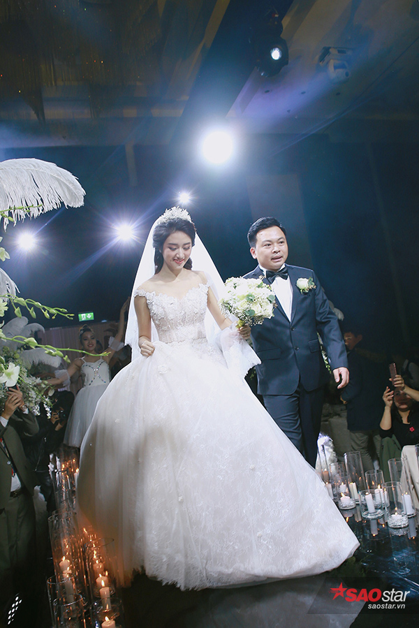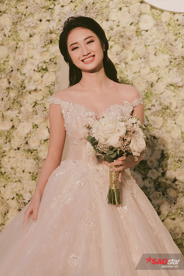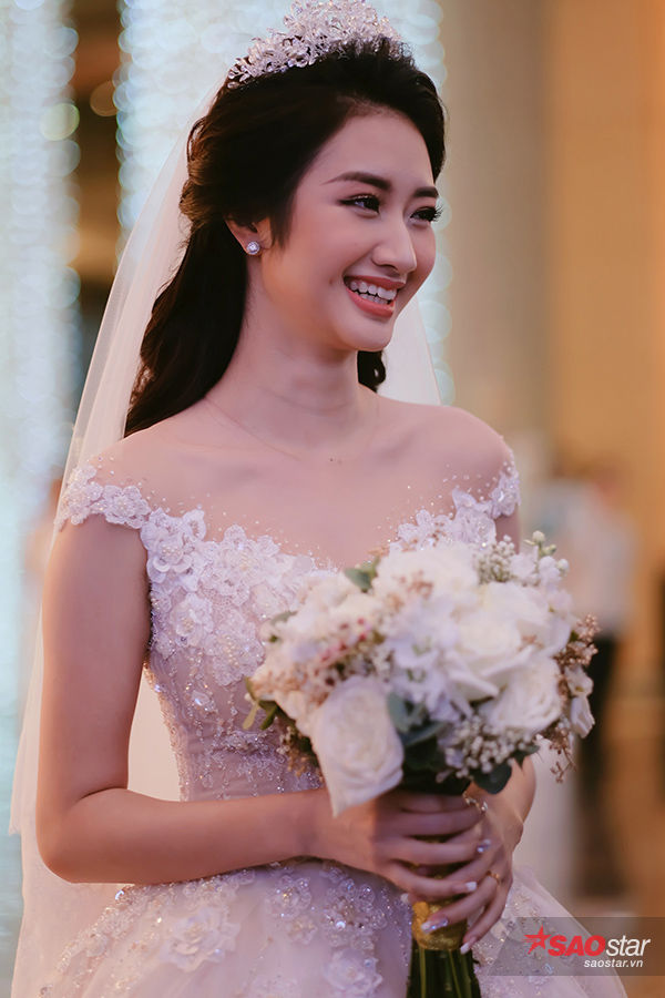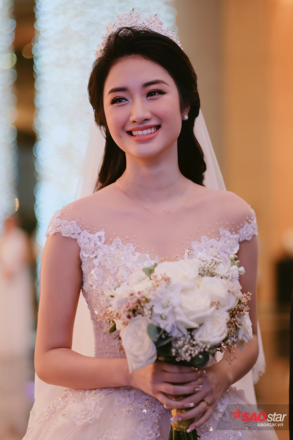 Đám cưới diễn ra trong không khí sang trọng, ấm cúng với hơn 1.000 khách mời đến chung vui, hầu như đều là bạn bè và người thân hai bên gia đình của cô dâu chú rể. Khoác lên mình bộ váy cưới lộng lẫy, gương mặt trang điểm nhẹ nhàng, Hoa hậu Thu Ngân trở nên vô cùng xinh đẹp. Cô liên tục nở nụ cười rạng rỡ, hạnh phúc bên chồng đại gia đứng đón tiếp quan khách.