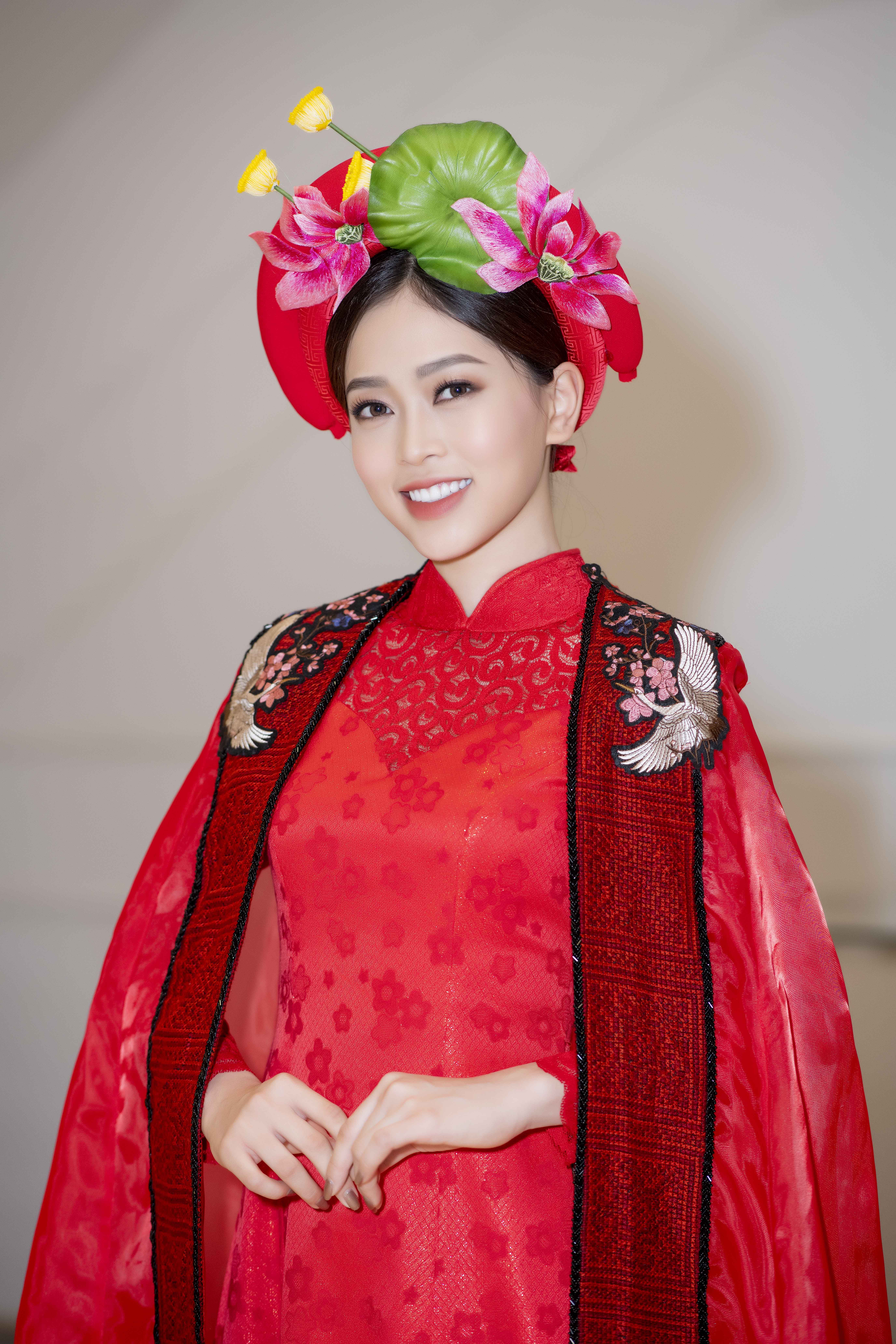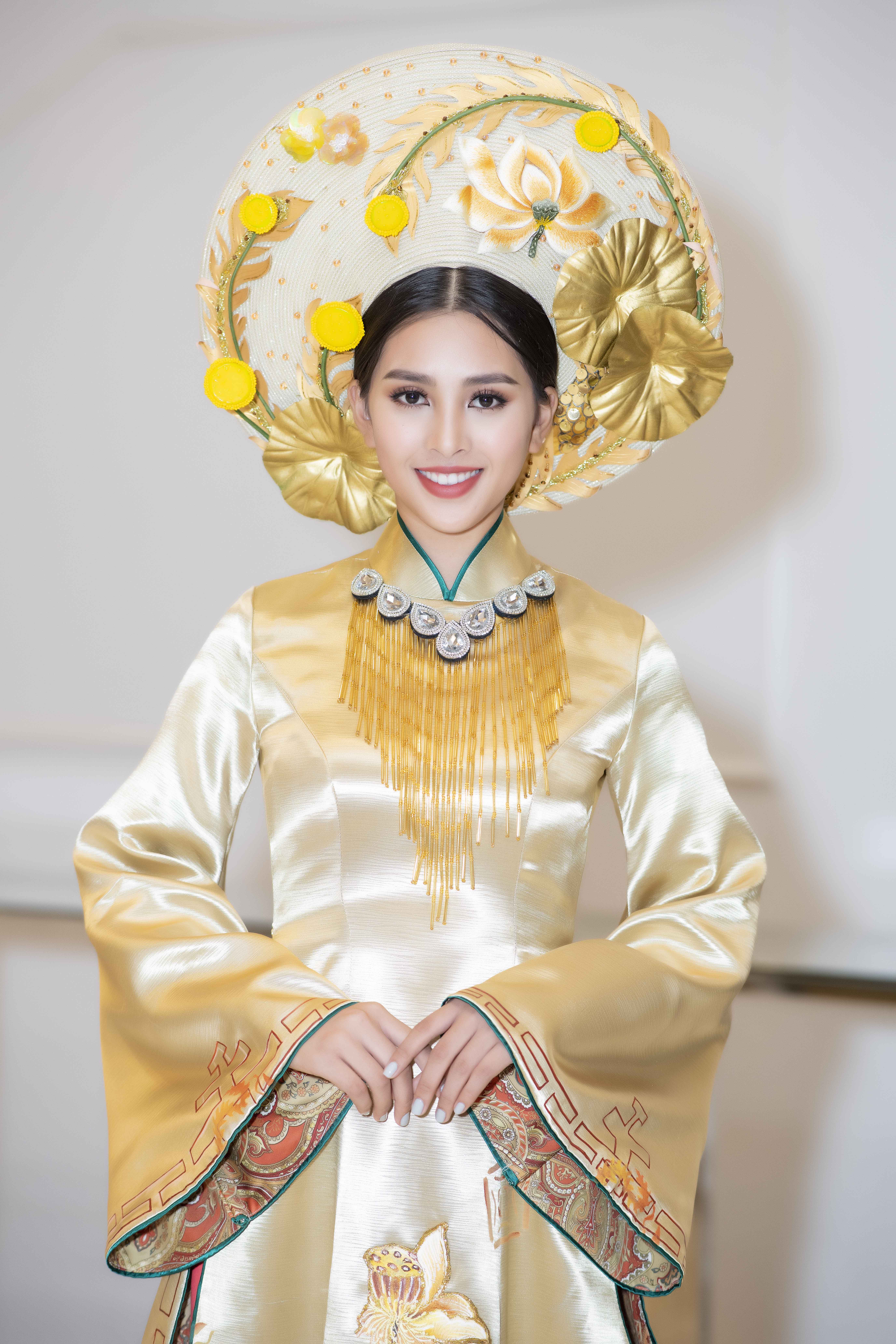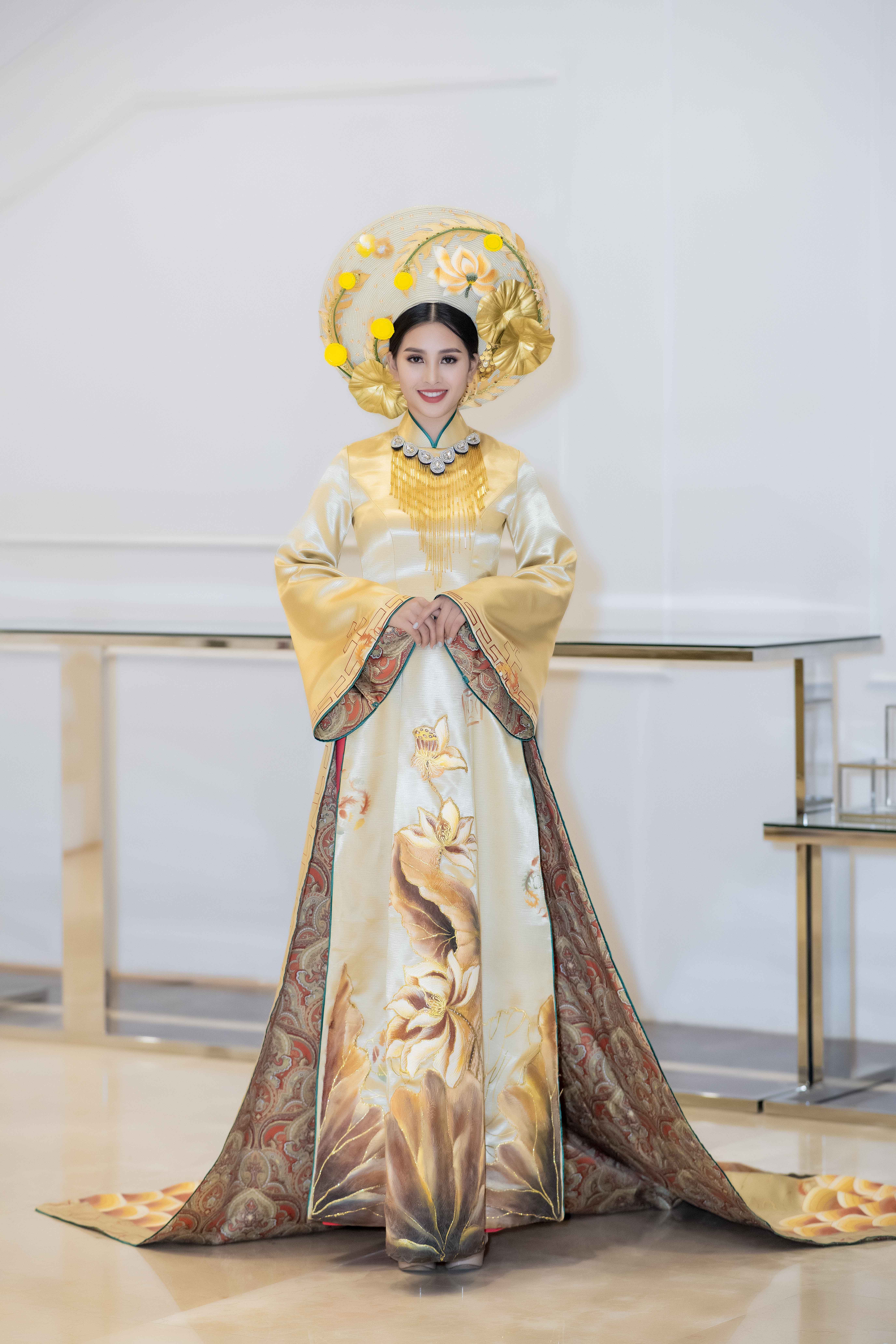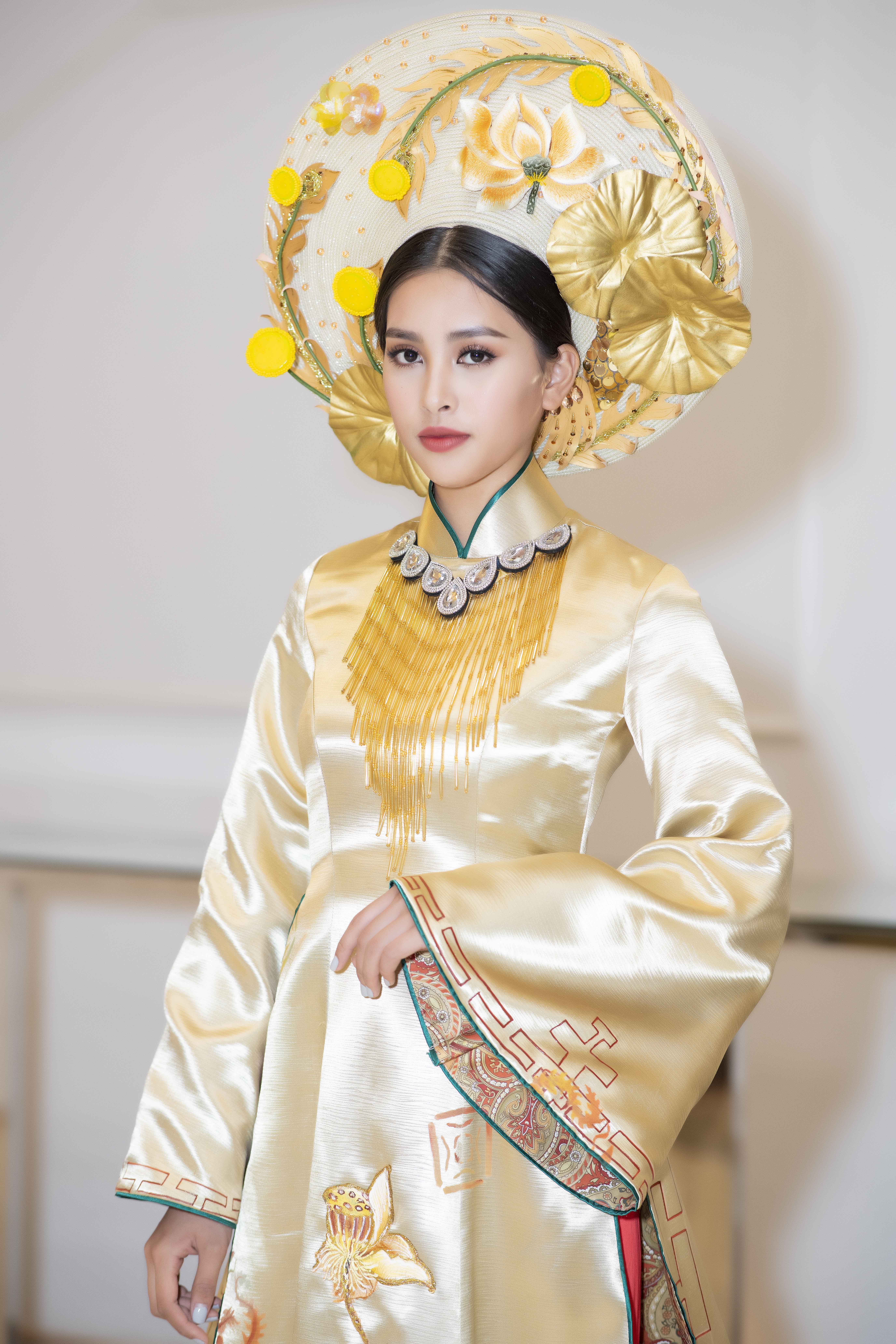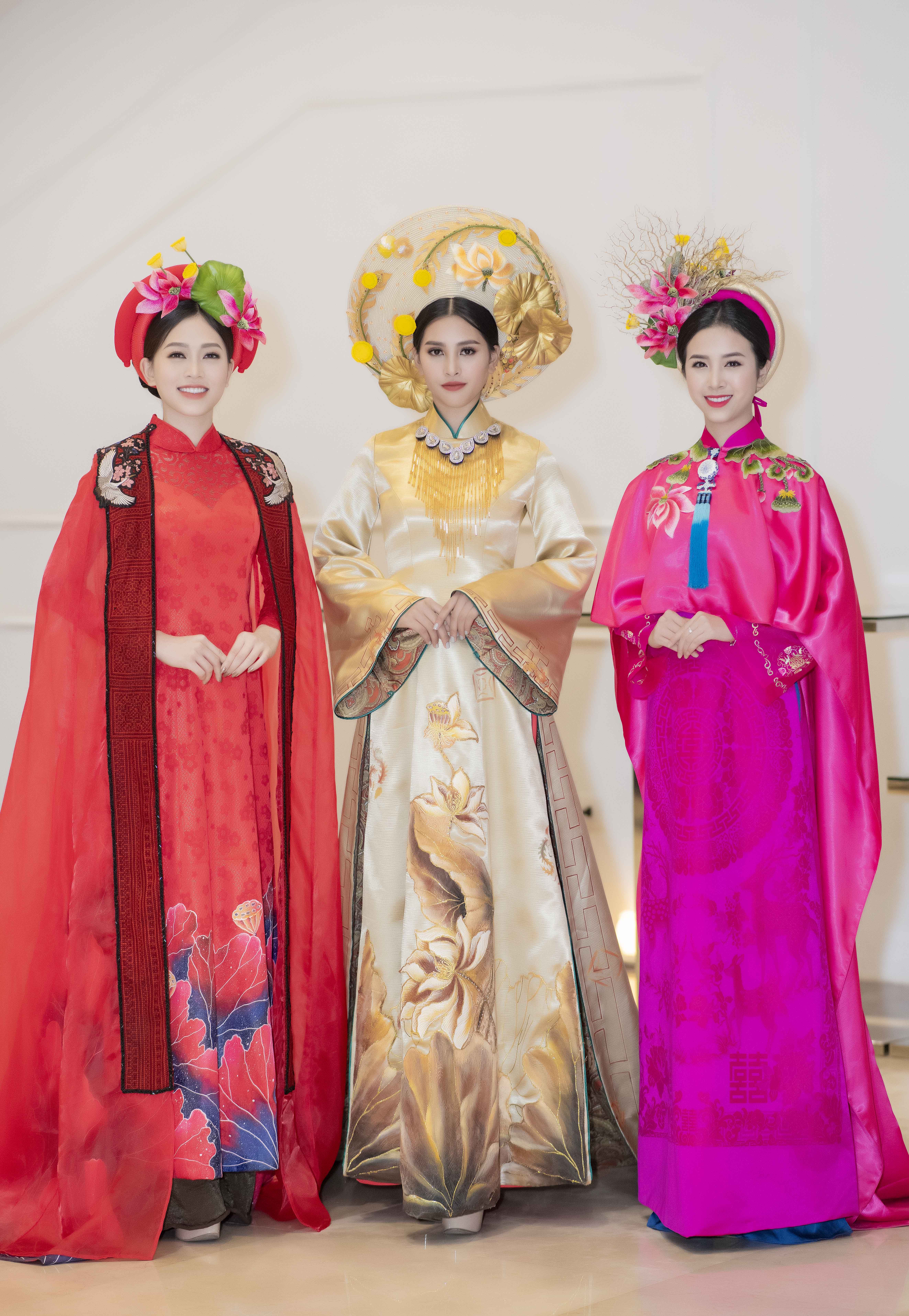 Nếu Tiểu Vy đảm nhận vị trí vedette với áo dài màu vàng - tượng trưng cho hình ảnh hoàng tộc thì Phương Nga và Thúy An lần lượt diện những tà áo dài mang sắc đỏ và hồng cùng những chiếc mấn được thiết kế tỉ mỉ.