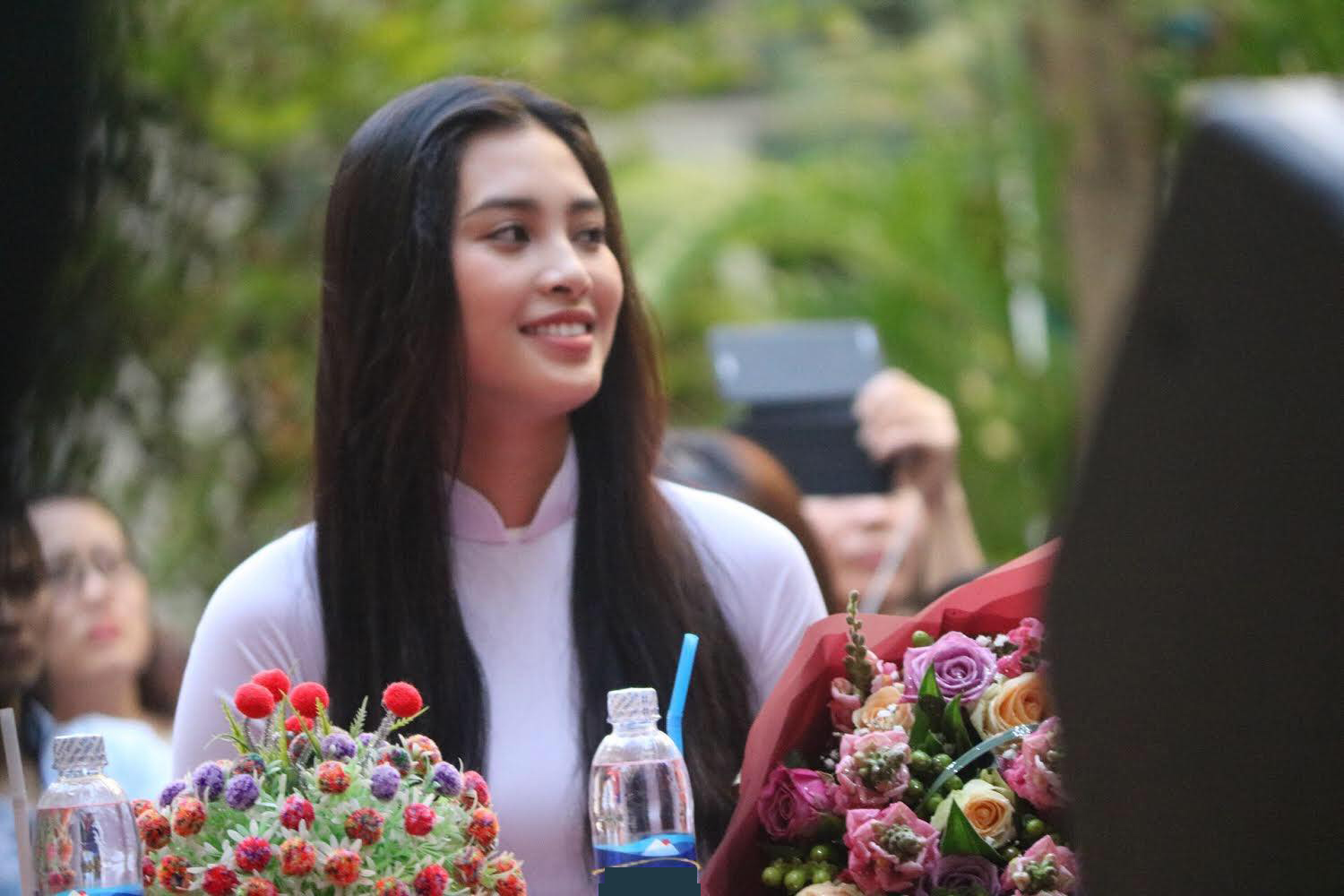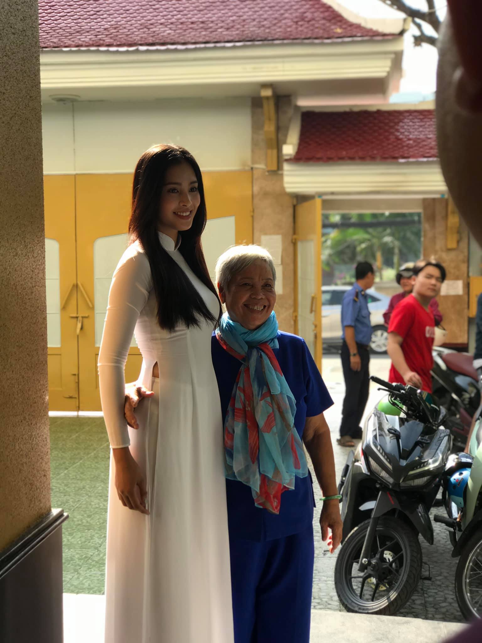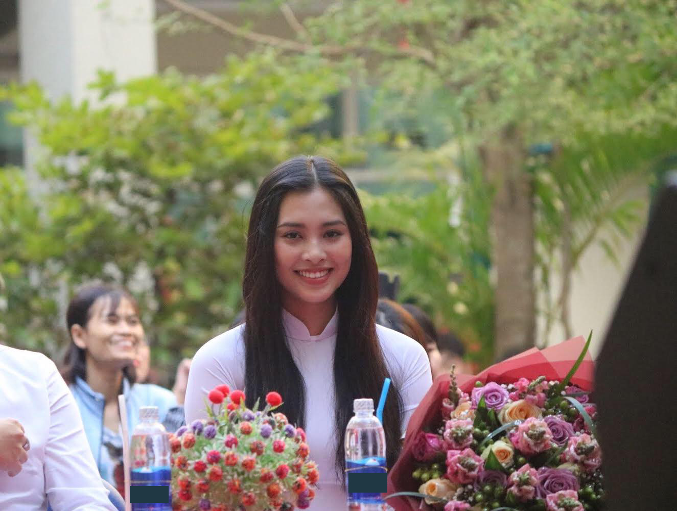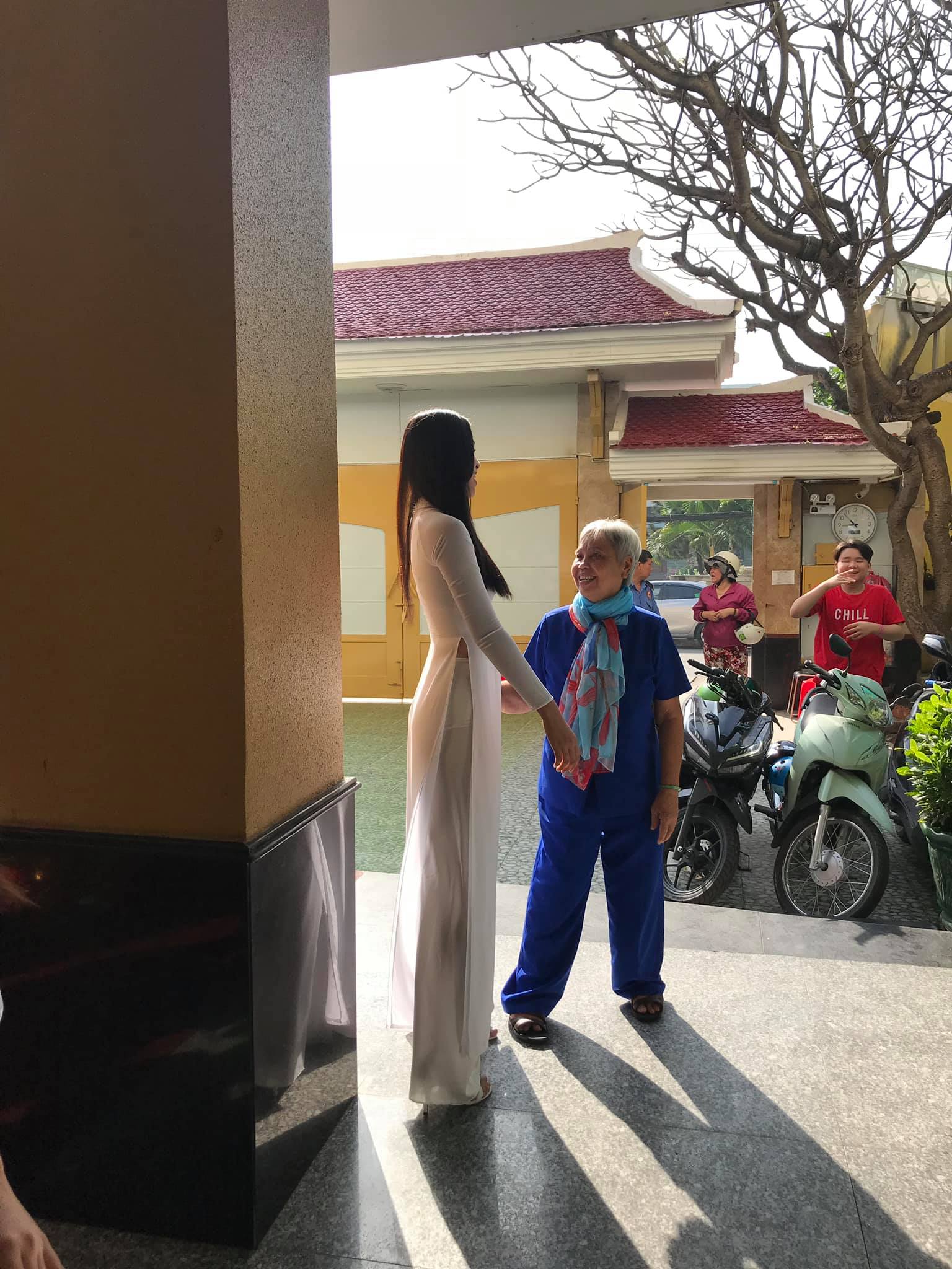 Xuất hiện tại trường xưa trong tà áo dài trắng, Tiểu Vy như đi ngược thời gian trở lại là cô học trò nhỏ quấn quýt bên thầy cô của mình. Về trường, đúng tâm thế của một cô học trò nhỏ, Tiểu Vy để mặt mộc dù tóc tai hơi bù xù nhưng gương mặt người đẹp vẫn toát lên vẻ đẹp phúc hậu, nhẹ nhàng và rất tây.