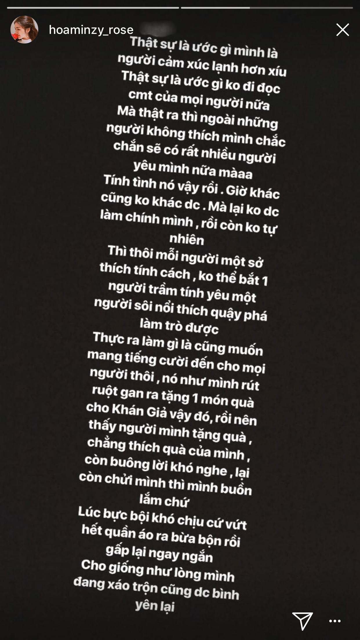 Mới đây, trên Instagram Story, Hoà Minzy chia sẻ hình ảnh thể hiện tâm trạng buồn bã khi đọc bình luận tiêu cực từ người hâm mộ. Cô viết: “Thật sự ước gì mình là người cảm xúc lạnh hơn xíu. Thật sự ước gì không đi đọc bình luận của mọi người nữa. Mà thật ra thì ngoài những người không thích mình chắc chắn sẽ có rất nhiều người yêu mình nữa mà.