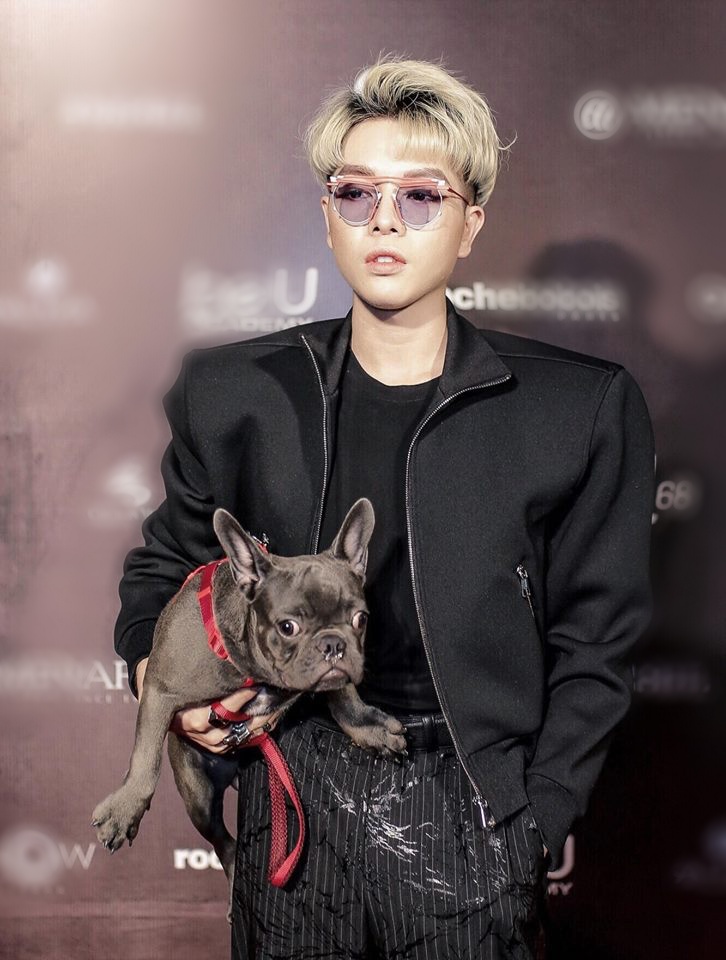 Đức Phúc và chú chó của Hoà Minzy tại một sự kiện thời trang.