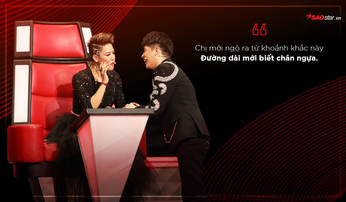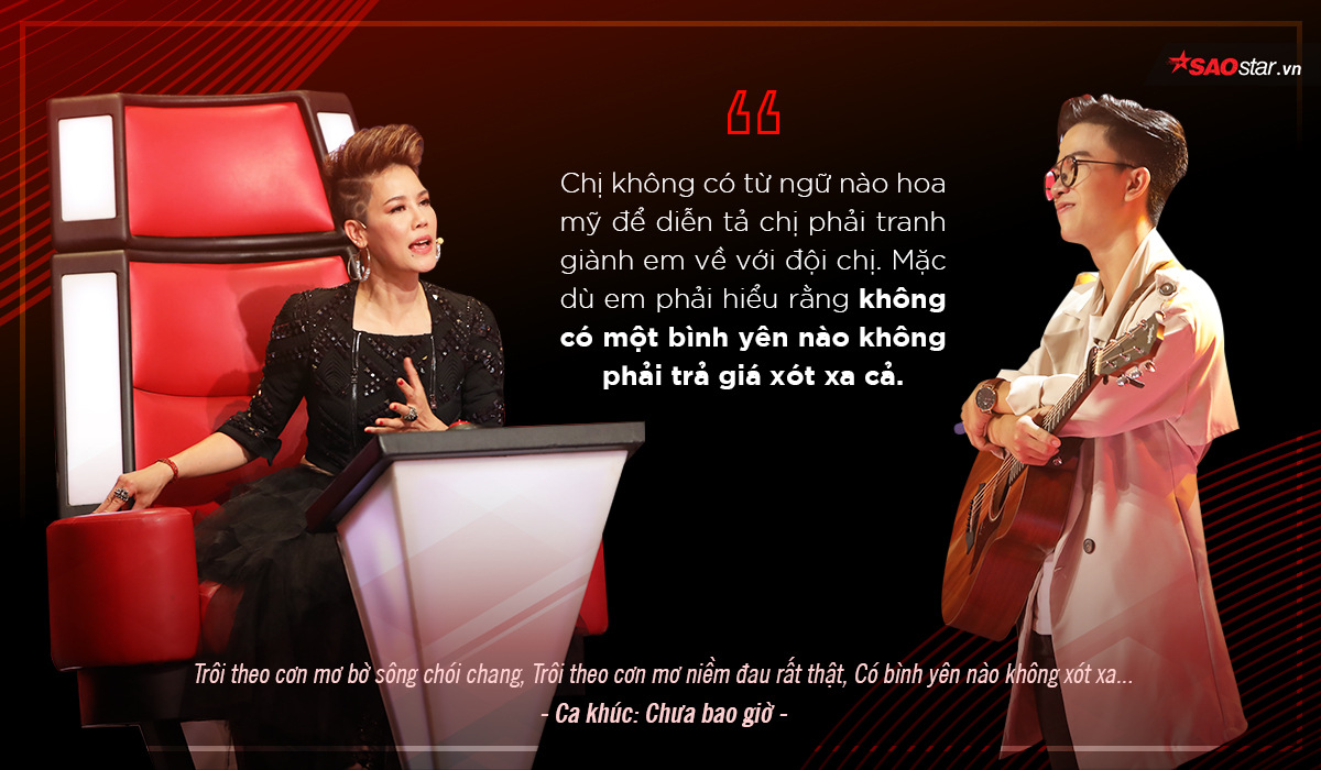 Đặc biệt, HLV Thu Phương còn dùng lời bài hát trong những ca khúc của chính mình để tung chiêu trên ghế nóng. Chắc hẳn ai cũng biết câu hát kinh điển “Có bình yên nào không xót xa” trong bài Chưa bao giờ nhưng ít ai biết Thu Phương và Lam Trường từng song ca bài hát Thôi anh hãy về.
