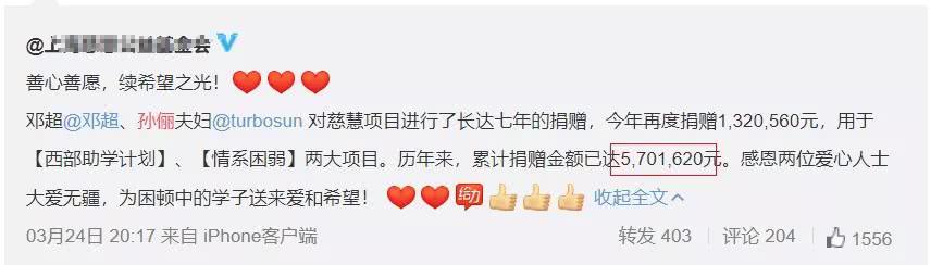 Mãi đến ngày 24 tháng 3, một tổ chức từ thiện của Thượng Hải đã đăng bài cảm ơn vợ chồng Đặng Siêu, Tôn Lệ đã tiến hành hạng mục quyên góp kéo dài bảy năm. Năm nay, họ lại quyên hơn 1 triệu NDT, số tiền tích lũy đã lên tới 5,7 triệu NDT (19 tỷ đồng), mang đến tình yêu cũng như sự hy vọng cho các em học sinh có hoàn cảnh khó khăn.