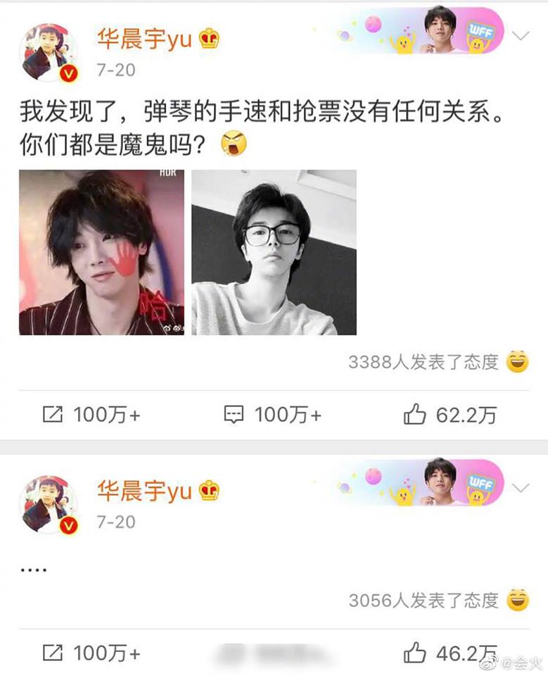 Để sơ tán lực chú ý của người hâm mộ, Hoa Thần Vũ đã đăng bài viết kêu gọi trò chuyện để bản thân có thể thành công mua vé nhưng người tính không bằng trời tính là có thật. Sau đó không lâu, Hoa Thần Vũ lại đăng thêm vài nói rằng “Tui giận rồi, tui muốn xóa Weibo”, thông qua đó có thể biết Hoa Hoa đã mua không được vé concert.
