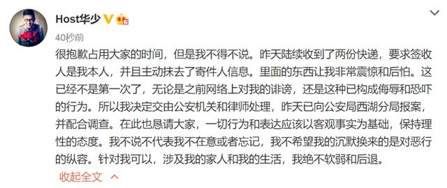 Ngày 17/01, MC Hoa Thiếu của nhà đài Chiết Giang đã tiết lộ rằng bản thân bị người nặc danh dọa. Ông viết: “Rất xin lỗi vì chiếm dụng thời gian của mọi người nhưng tôi không thể không nói. Ngày hôm qua tôi đã nhận hai món hàng ký gửi và người ký nhận món hàng đó là tôi, đồng thời chủ động xóa mất những thông tin ký gửi. Đồ vật trong đó thật sự làm tôi kinh hãi và sợ. Đây không phải là lần đầu tiên, dù là những lời phỉ báng tôi trên mạng xã hội hay hành động lăng mạ hay đe dọa. Chính vì vậy tôi quyết định gửi cho sở cảnh sát và luật sư để họ xử lý.