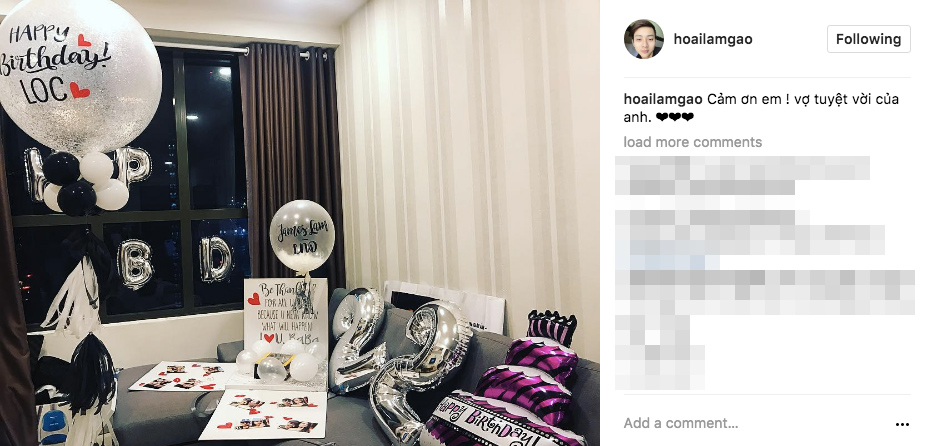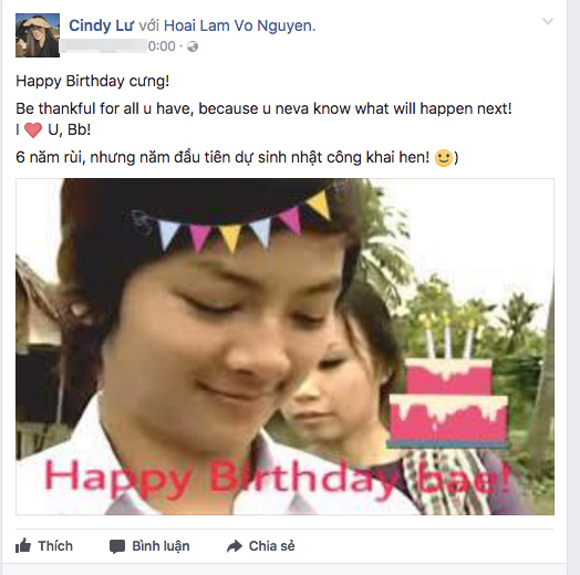 Trong khi đó, trên Facebook cá nhân của mình, Hoàng Ngọc cũng không quên gửi lời chúc tới bạn trai. “Happy Birthday cưng! Be thankful for all you have, because you neva know what will happen next! I love you! 6 năm rùi, nhưng năm đầu tiên dự sinh nhật công khai” - Bạn gái Hoài Lâm viết.