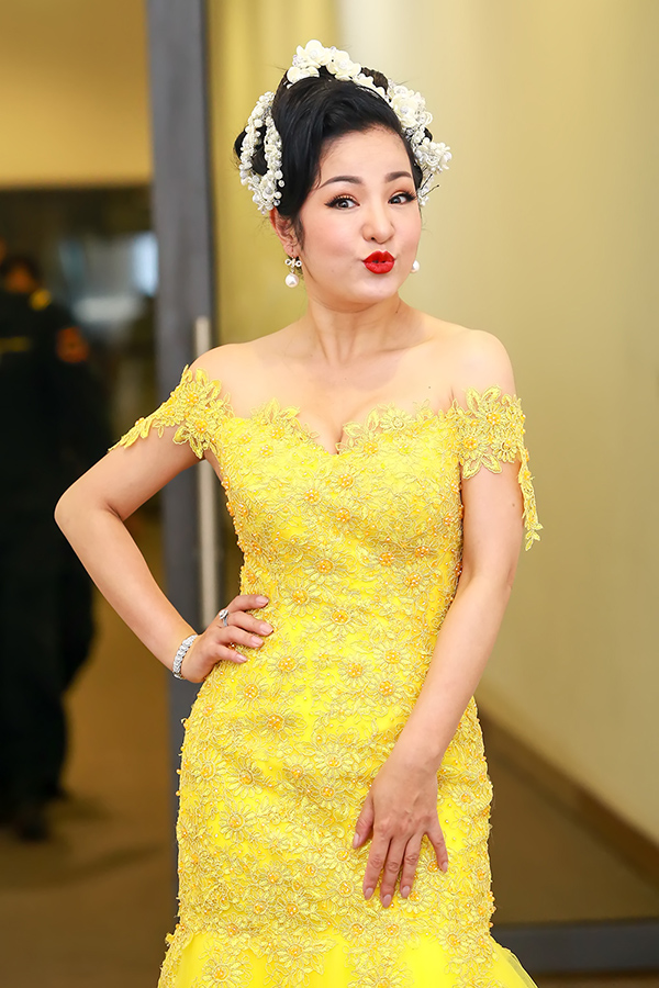 Danh hài Thúy Nga diện bộ váy vàng lộng lẫy.