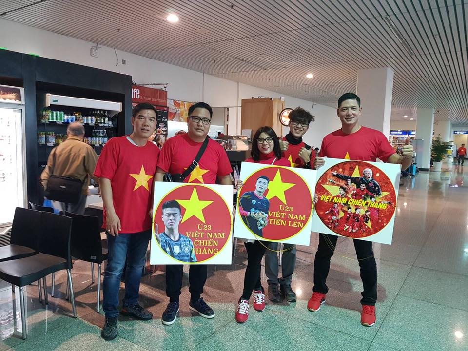 Rạng sáng 27/1, khá đông sao Việt như vợ chồng Hoàng Bách, Bình Minh, Minh Xù,… cùng đông đảo người hâm mộ bộ môn “thể thao vua” đã có mặt tại sân bay Tân Sơn Nhất, TP.HCM háo hức chuẩn bị lên đường sang Thường Châu (Trung Quốc) để cổ vũ đội tuyển U23 Việt Nam.