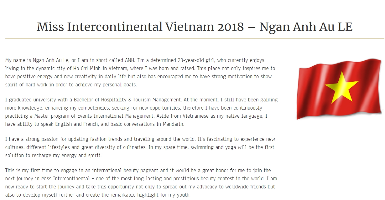 Vẫn có mặt tham gia cuộc thi như chẳng gặp khó khăn gì, Ngân Anh gây bất ngờ với phần profile được đăng tải trên trang web chính thức của cuộc thi Miss Intercontinental. Ghi điểm với hình thể đạt chuẩn nhưng xem ra Ngân Anh lại không thuyết phục đông đảo công chúng về nhan sắc “thất thường”.