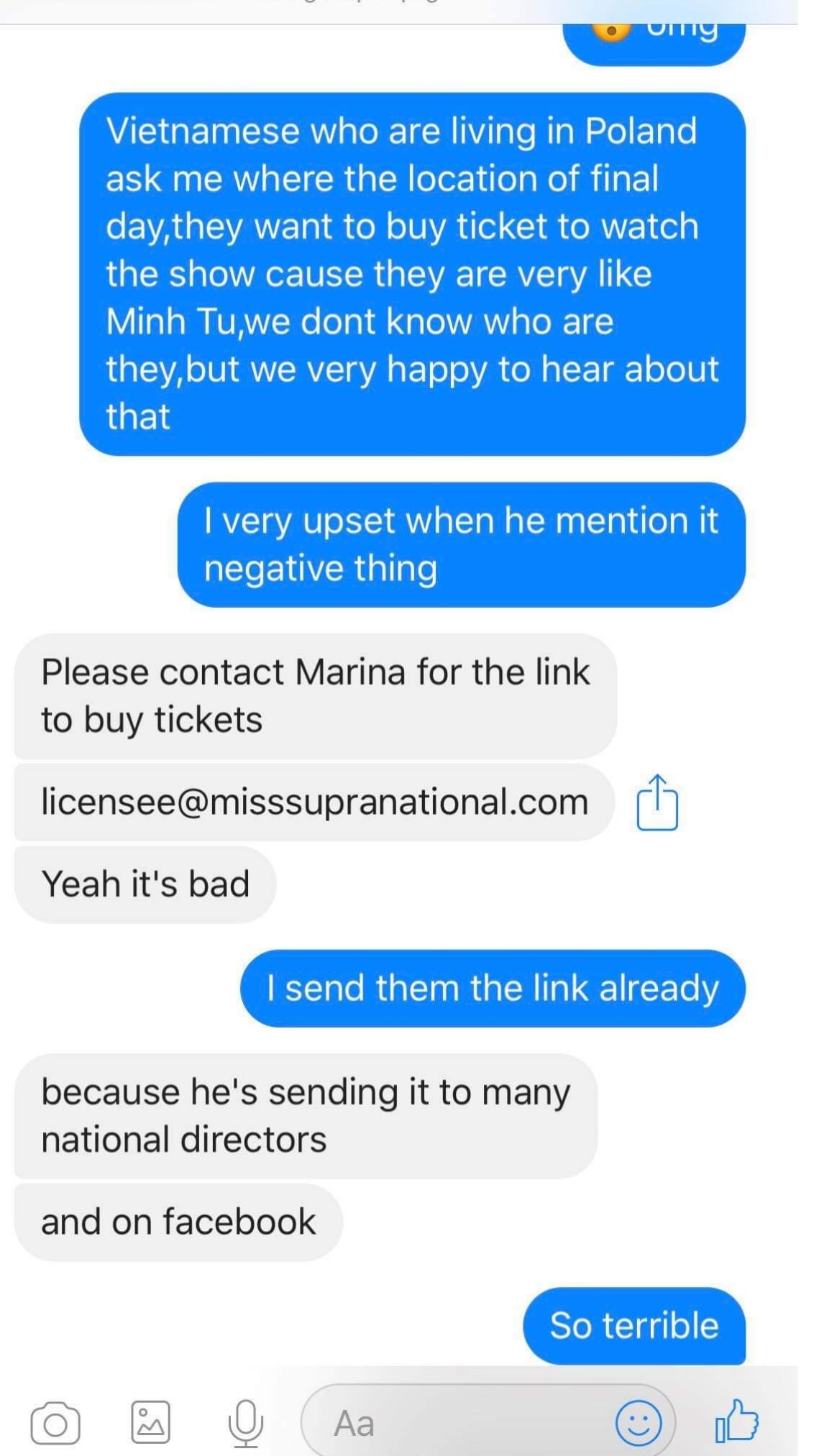 Bên cạnh đó, Hoa hậu Hải Dương công khai 2 đoạn tin nhắn kèm chú thích về việc các Giám đốc nắm giữ bản quyền Miss Supranational nhiều quốc gia bị gửi tin nhắn thông báo Việt Nam đã chắc suất Hoa hậu vì có đến tận 30 người sang Ba Lan cổ vũ. Điều này khiến họ phẫn nộ và khiếu nại đến BTC Miss Supranational 2018 tại Ba Lan.