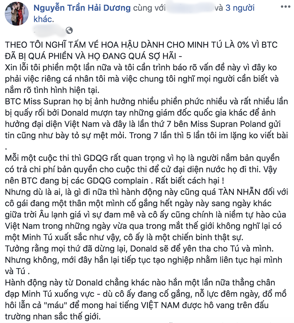 Những ngày qua, đại diện Việt Nam Minh Tú đã mang về không ít niềm tự hào cho nước nhà khi liên tục có những biểu hiện nổi bật cũng như luôn giữ thái độ thân thiện, sẵn sàng giúp đỡ bạn bè quốc tế tại Miss Supranational 2018. Khi mọi thứ dường như đang rất tốt đẹp thì mới đây, Hoa hậu Hải Dương bất ngờ đăng đàn công khai việc quân Asia's Next Top Model 2017 đang vướng rắc rối ngoài ý muốn tại cuộc thi. Chia sẻ này ngay lập tức nhận được đông đảo sự quan tâm của cư dân mạng bởi nhân vật được nhắc đến cũng từng bị Hoa hậu Hải Dương “gọi tên” khi loạt ảnh quá khứ của Minh Tú bị gửi tới Ba Lan trước khi cô nàng lên đường.