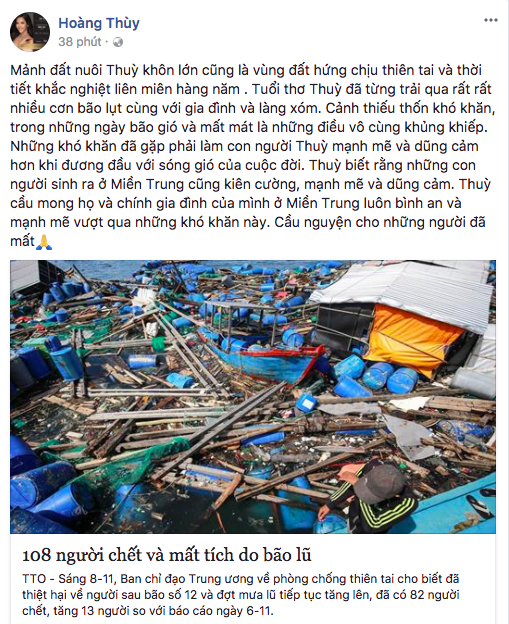 Mới đây, thông qua trang Facebook cá nhân, Hoàng Thuỳ có những chia sẻ với các nạn nhân xấu số cũng như hàng loạt gia đình phải hứng chịu hậu quả nặng nề sau cơn bão số 12.
