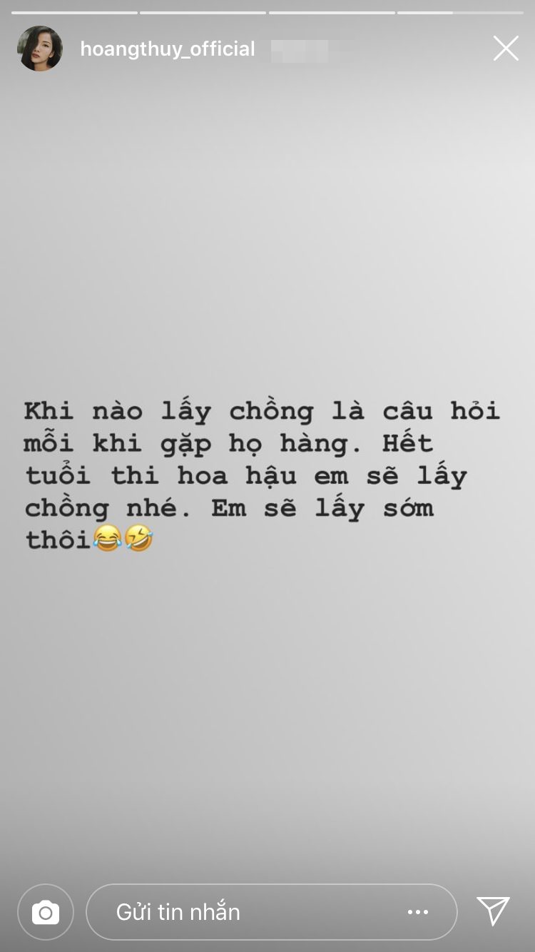 Mới đây, Hoàng Thùy bất ngờ chia sẻ dòng trạng thái gây chú ý về việc “chống lầy” của mình trên trang Instagram cá nhân: “Khi nào lấy chồng là câu hỏi mỗi khi gặp họ hàng. Hết tuổi thi hoa hậu em sẽ lấy chồng nhé. Em sẽ lấy sớm thôi“. Năm nay người đẹp vừa bước sang 27 xuân xanh, nếu tuyên bố này là chắc chắn thì chỉ 2 năm nữa thôi cô sẽ có tin vui. Báo luôn để mọi người không phải “nôn nóng” hỏi han thêm nữa, cô Thùy nhỉ!