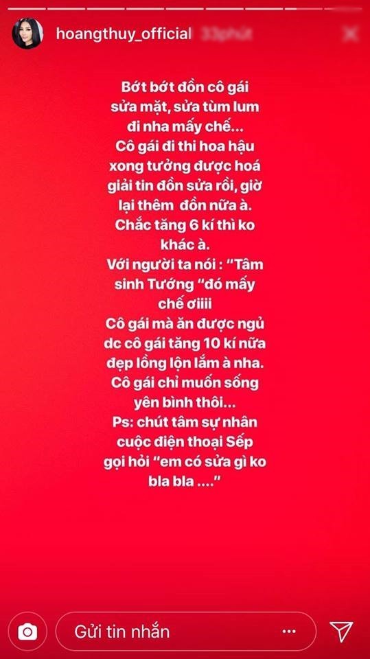 Hoàng Thuỳ lên tiếng: “Bớt đồn cô gái sửa mặt, sửa tùm lum đi nha mấy chế… Cô gái đi thi hoa hậu xong tưởng được hóa giải tin đồn sửa rồi, giờ lại thêm đồn nữa à. Chắc tăng 6 ký thì không khác à? Với người ta nói: ‘Tâm sinh Tướng’ đó mấy chế ơi. Cô gái mà ăn được ngủ được, cô gái tăng 10 ký nữa đẹp lồng lộn lắm à nha. Cô gái chỉ muốn sống yên bình thôi…”.