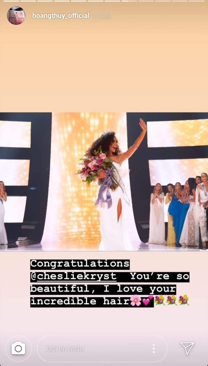 Cũng hào hứng chờ đón kết quả của Miss USA 2019 và muốn biết xứ cờ hoa sẽ cử nhan sắc nào tham dự Hoa hậu Hoàn vũ năm nay như các fan, Hoàng Thùy đã nhanh chóng chia sẻ hình ảnh kèm lời chúc mừng Chelsie Kryst trên Instagram cá nhân: “Chúc mừng Chelsie Kryst. Bạn rất xinh đẹp. Tôi rất thích mái tóc ấn tượng của bạn“.