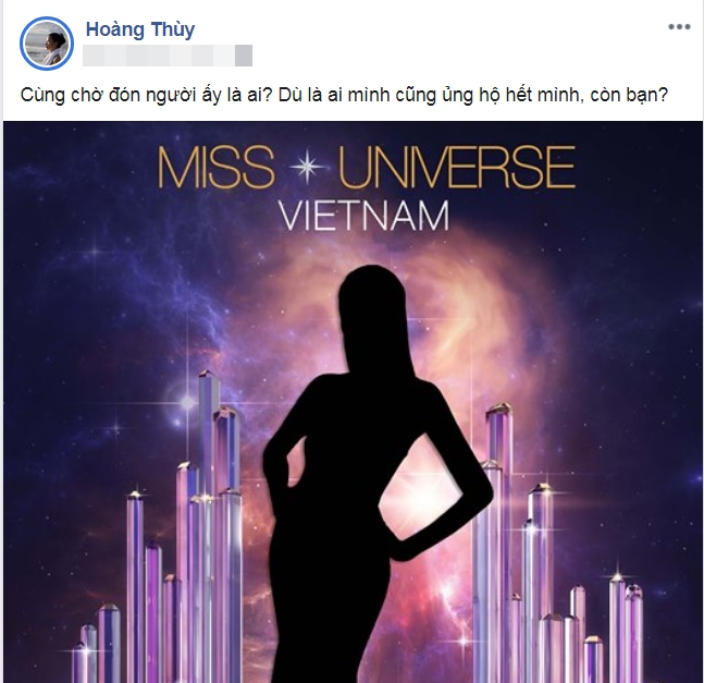 Trước đó, khi Hoa hậu Hoàn vũ Việt Nam úp mở công bố đại diện Việt Nam tham gia Miss Universe 2018, ứng viên sáng giá nhất - Hoàng Thùy cũng nhanh chóng chia sẻ sự ủng hộ của chính bản thân mình dành cho nhan sắc được chọn: “Cùng chờ đón người ấy là ai? Dù là ai mình cũng ủng hộ hết mình, còn bạn?“.