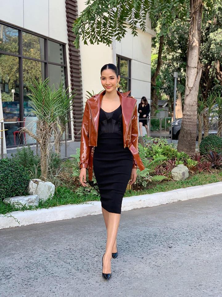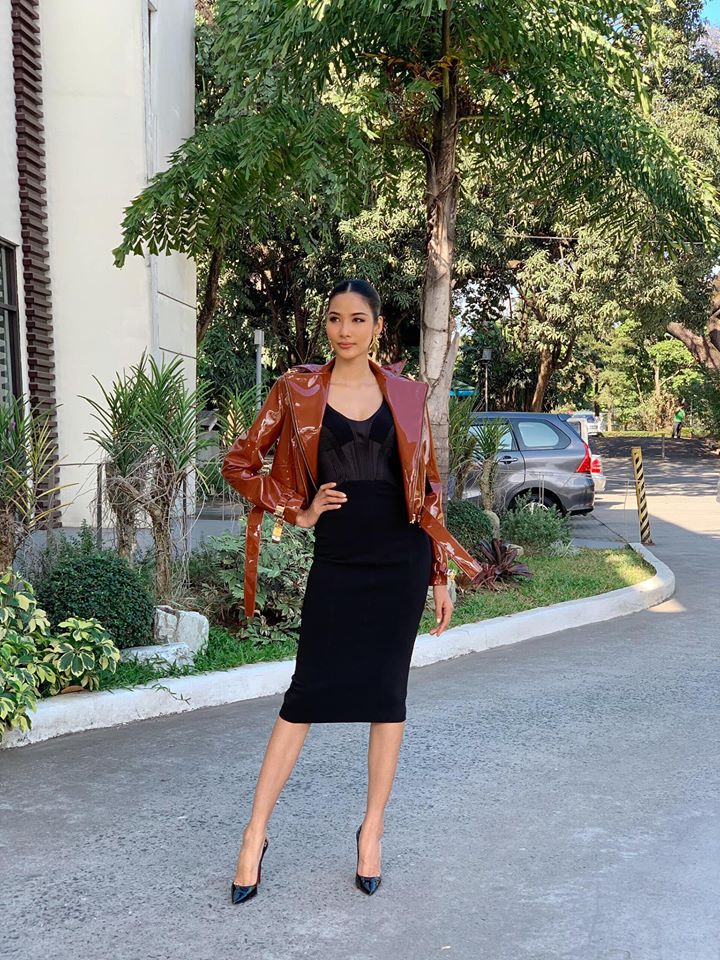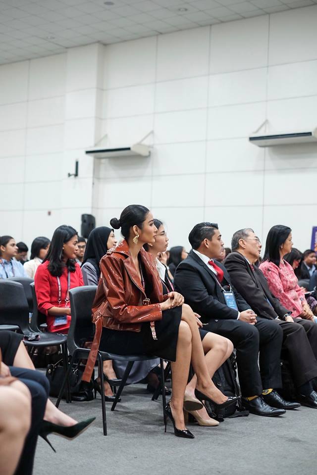 Đi kèm lời chia sẻ là những bức ảnh trong buổi sáng diễn thuyết. Hoàng Thùy lựa chọn cho mình một bộ trang phục rất chỉn chu. Với chiếc váy màu đen cùng áo khoác da bên ngoài, Hoàng Thùy trông giống một trong những người phụ nữ quyền lực. Mái tóc được chải ngược và bối lên cao khiến khuôn mặt của Á hậu trông ưu nhìn hơn.