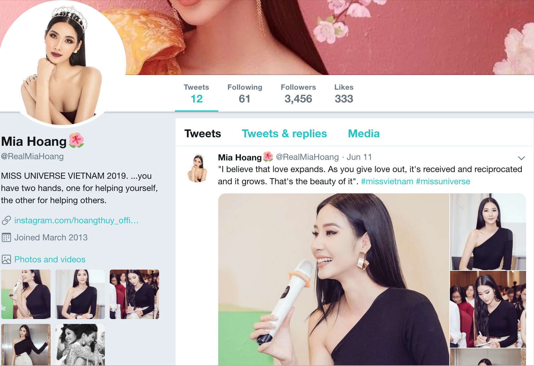 Mới đây, đại diện Việt Nam tại Hoa hậu Hoàn vũ Thế giới 2019 - Hoàng Thùy bất ngờ đăng tải dòng trạng thái tố cáo tài khoản dám giả mạo mình trên mạng xã hội quốc tế Twitter với danh xưng là Miss Universe Vietnam 2019.