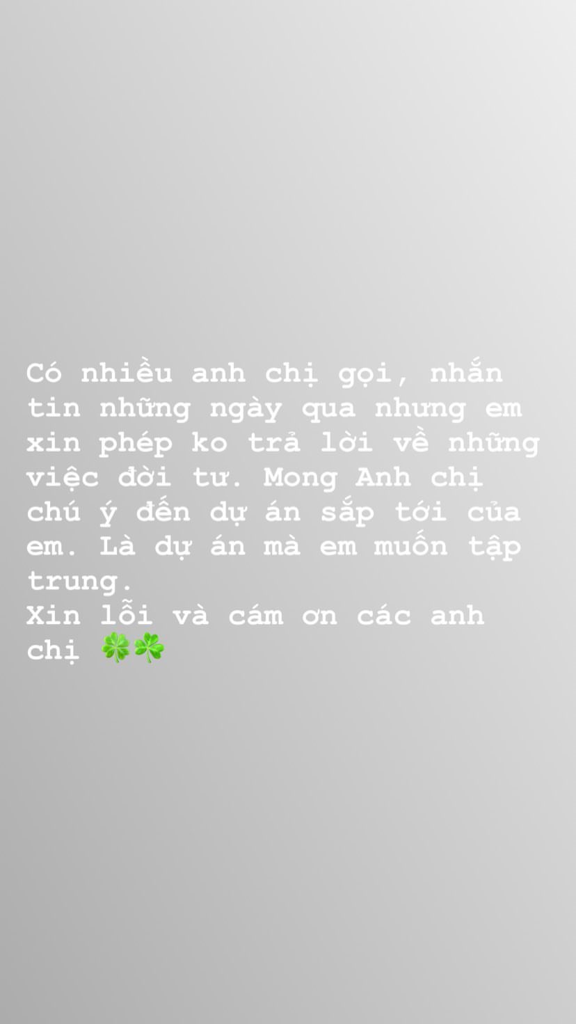 Á hậu chia sẻ “Có nhiều anh chị gọi, nhắn tin những ngày qua nhưng em xin phép không trả lời về những việc đời tư. Mong anh, chị chú ý đến dự án sắp tới của em. Là dự án em muốn tập trung. Xin lỗi và cám ơn các anh chị”.